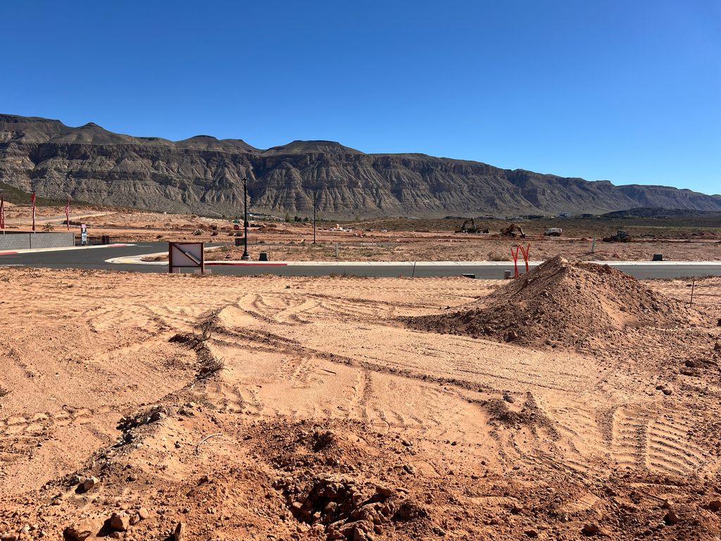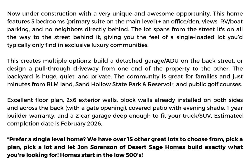 Now under construction with a unique lot and great views. 5 bedrooms (primary on main) + office/den, RV/boat parking, and no rear neighbors. The lot spans from street to street, offering privacy and the ability to add a detached garage/ADU at the back or create a pull-through driveway. Quiet community great for family, just minutes to BLM land, Sand Hollow Reservoir, and golf. Excellent floor plan with 2x6 exterior walls. Block walls installed on both sides and across the back with gate access. Large backyard with covered patio and evening shade. 2-car garage deep enough for truck/SUV. Includes 1-year builder warranty. Estimated completion February 2026.