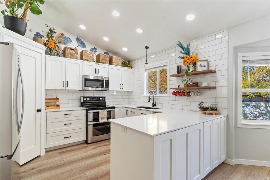This open and bright multi-level home has seen a long list of thoughtful updates-too many to name them all, but here are some of the highlights. The kitchen was completely remodeled with quartz countertops, stainless steel appliances, a subway tile backsplash, and custom soft-close cabinets with fresh LED lighting. New carpet was added in 2020, and durable LVP flooring was installed on the main level in 2021. The railings were replaced that same year with custom steel designs, giving the home a clean, modern look. Fresh paint and new wainscoting in several rooms add to the inviting feel. Other updates include a new roof (2019), new front door, south-side windows, and a sliding glass door in the family room. A tankless water heater was added in 2021, along with a remodel of the laundry room and half bath, plus built-in shelving in the family room. The Smart Wave Solar panels are fully paid off and can even power the home independently if the grid goes down. Also includes electric car charging station.