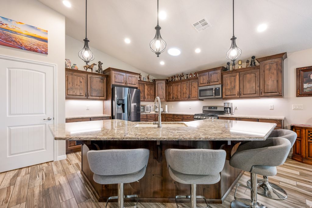 Welcome to this beautifully maintained home in Sugar Plum, offering a thoughtful design, and stunning southern Utah surroundings. This home features an inviting open floor plan with large windows that fill the home with natural light and frame the peaceful views of the neighborhood. At the heart of the home, you'll find a beautifully appointed kitchen with modern finishes, a large island, and seamless flow into the dining and living areas. The primary suite is generously sized with a spacious walk-in shower and walk-in closet. One of the outstanding features is the attached casita, complete with its own full-size refrigerator, sink, dining area with patio access, washer and dryer, private bedroom, and full bathroom, creating an ideal setup for guests or extended family. Step outside to enjoy a fully fenced and landscaped yard, covered patio, and RV parking with electrical hookups and sewer clean out. The location is near the soon to be Wheels Park, freeway access, Warner Valley and top-rated schools.