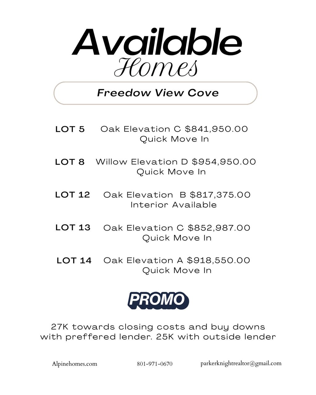 QUICK MOVE-IN READY NOW! $27,000 FLEX INCENTIVE Use it toward closing costs, rate buydown, or a combo when you finance with our preferred lender.Live in the highly sought-after Oak floor plan with a full basement already plumbed and ready to finish as an ADU/guest suite (separate entrance possible) perfect for future multi-generational living, guests, or rental income.Nestled on a quiet cul-de-sac in the stunning Freedom View Cove community, this home boasts jaw-dropping lake and mountain views and one of the largest, most usable yards in the neighborhood.Main Level Highlights Bedroom + full bath (ideal for guests or in-laws) Gorgeous kitchen with quartz counters, 42" upper cabinets, gas range, and durable LVP flooring Covered deck right off the kitchen-perfect for summer BBQs and sunset views Private enclosed office (work-from-home heaven!) Upper Level Spacious primary suite + 3 additional bedrooms Huge loft for movies, play, or second living area This home truly has it all: space for entertaining, room for everyone to spread out, and a basement already plumbed and waiting for your custom ADU/guest suite. Call Parker today to schedule your private tour-homes like this don't last! Buyer & Buyer's agent to verify all information.