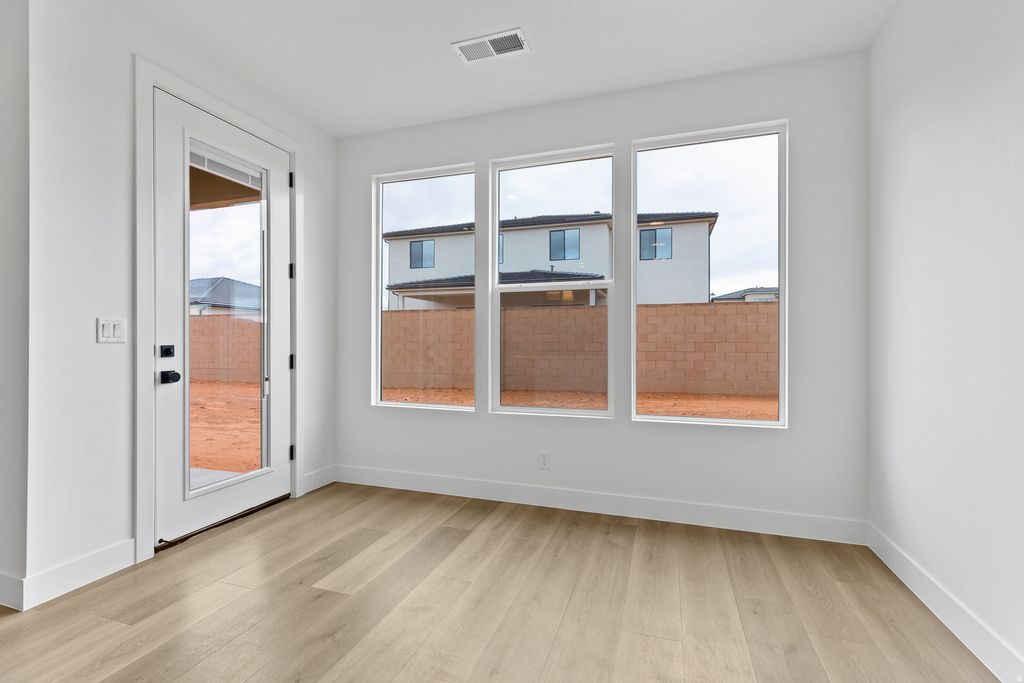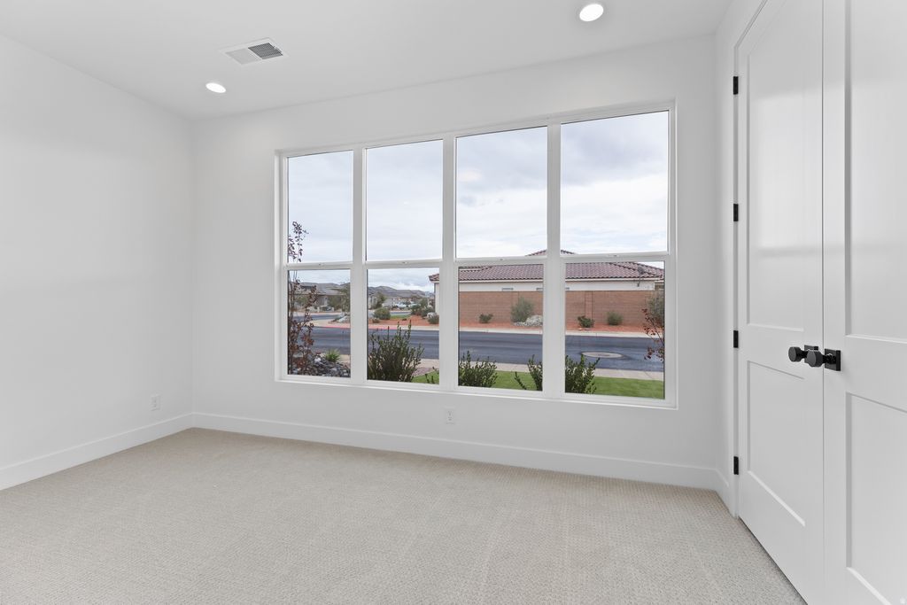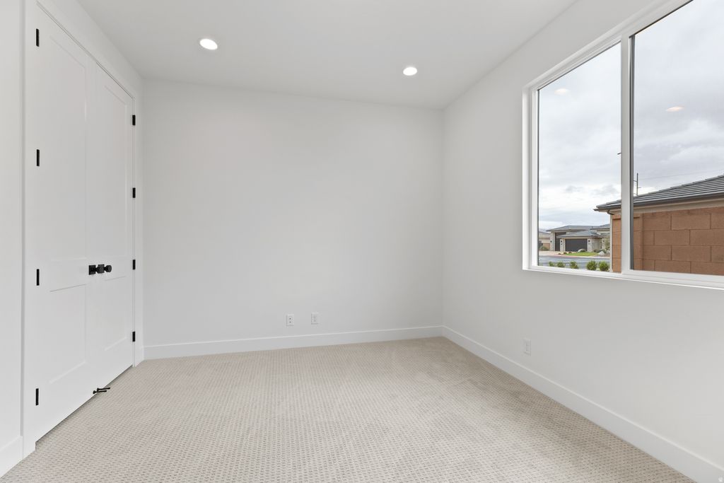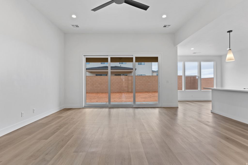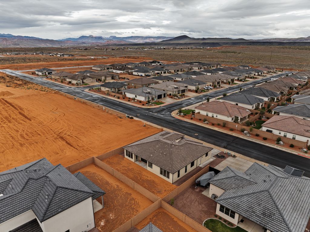 Brand new home with a large backyard with full block wall fencing, rain gutters, and xeriscape front yard with RV parking. Curb appeal shines with stone accents, modern sconces, and a welcoming entry. Inside you'll find tall ceilings, 8-foot doors, and an open great room with a large 3-panel sliding glass door that opens to the covered patio-perfect for indoor/outdoor living. The kitchen is beautifully finished with quartz countertops, custom soft-close cabinetry, stainless steel appliances (including refrigerator), and a natural gas range. The split floor plan offers two bedrooms on each side of the home for added privacy, 3 bathrooms, and the laundry room includes upper cabinets for convenience. The spacious primary suite features canned lights, ceiling fan, and a gorgeous bath with a soaker tub, tiled walk-in shower with euro glass door, and double vanities. Other upgrades include a natural gas BBQ stub, tankless water heater, tiled showers, no carpet in the main living areas, and space for a mud bench. Located in the Dixie Power service area. *All information deemed reliable but buyer to verify.