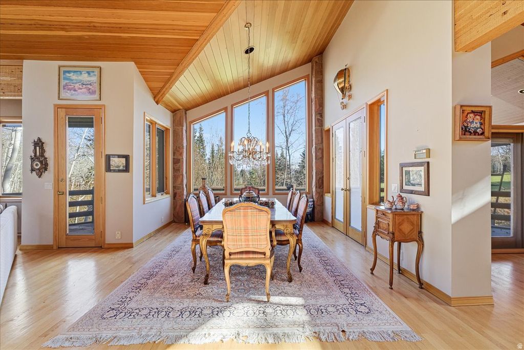 Hidden beneath a canopy of mature trees in Thaynes Canyon Park City, this four-bedroom, four-and-a-half-bath mountain residence offers exceptional privacy with direct adjacency to the Park City Golf Course. Built in 1990 and designed by respected local architect David White, with construction by Michael Allred, the home blends clean contemporary lines with authentic alpine character across 7,282 square feet of refined living space. No HOA. - The Great Room serves as the architectural centerpiece, featuring dramatic vaulted ceilings, a striking lodgepole column, and expansive windows that frame the surrounding forest year-round. The kitchen includes smooth granite countertops, custom wood finishes, and a concealed pantry/work space that preserves the open flow of the main entertaining areas. - The primary suite offers a quiet private retreat within the home. Additional bedrooms provide flexibility for guest suites or home offices. Multiple living areas support both large gatherings and everyday living. - Outdoor living is highlighted by a back deck overlooking the sixth hole of the Park City Golf Course, creating a tranquil setting that feels secluded while remaining minutes from Main Street Park City, ski resorts, dining, and shopping. The property borders Rotary Park and sits near the Iron Mountain Trail System, providing immediate access to Park City's year-round outdoor recreation. - Additional features include a covered entry, three-car garage, vaulted interior volumes, and mature landscaping. - Thaynes Canyon is one of Park City's most centrally located and lightly traded luxury neighborhoods, where properties of this scale, architectural pedigree, and golf-course proximity are rarely offered. Information deemed reliable but not guaranteed.