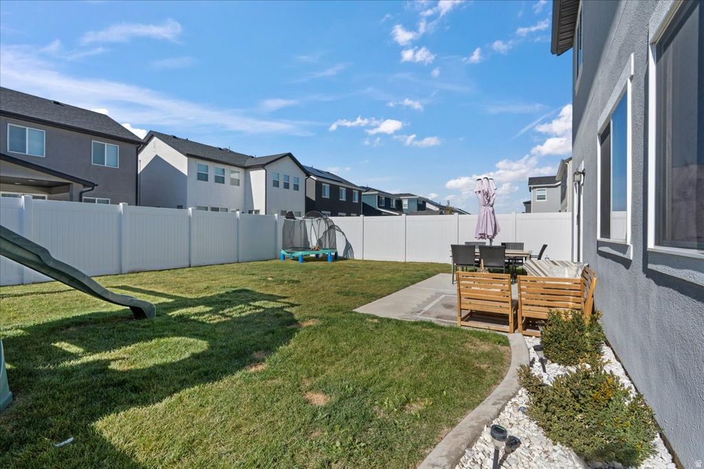 Step into comfort and style with this beautiful 4 bedroom, 2.5 bath home full of thoughtful updates! Nestled in a friendly and new Syracuse community that offers both comfort and convenience just minutes from the new West Davis Corridor entrance for an easy commute. The brand-new Syracuse Arts Academy is found close by in addition to a brand-new public school opening next year. The home has quick access to multiple walking trails, and the new Syracuse Sports complex will be found close by. Inside you will love the warm and inviting open floor plan with newly painted accent walls in the entryway and living room. The dining area features a brand-new chandelier and the kitchen shines with newly installed pendant lights perfect for entertaining or everyday living. Upstairs you will find the spacious master suite. It features a ceiling fan for added comfort. The walk-in closet is generously sized with plenty of storage area. The laundry room is found nearby with built in cabinets for convenient and extra storage space. This home features a zoned heating and cooling system, allowing you to control the temperature upstairs and downstairs separately. The fully fenced backyard offers privacy and plenty of space to play, complete with a playground set that's included. It also features extended concrete patio space, providing plenty of room for a cozy lounge area. The yard is beautifully landscaped with shrubs and planted flowers making it a peaceful retreat. Enjoy neighborhood amenities including a community pool, playground, park and pickleball court, all within walking distance. Washer, dryer and refrigerator are all included, making your move that much easier. Buyer is advised to obtain an independent measurement & to verify all information, including square footage total & layout. Don't miss this incredible home in one of Syracuse's most desirable communities!