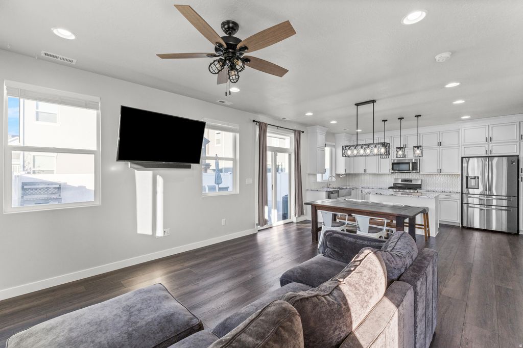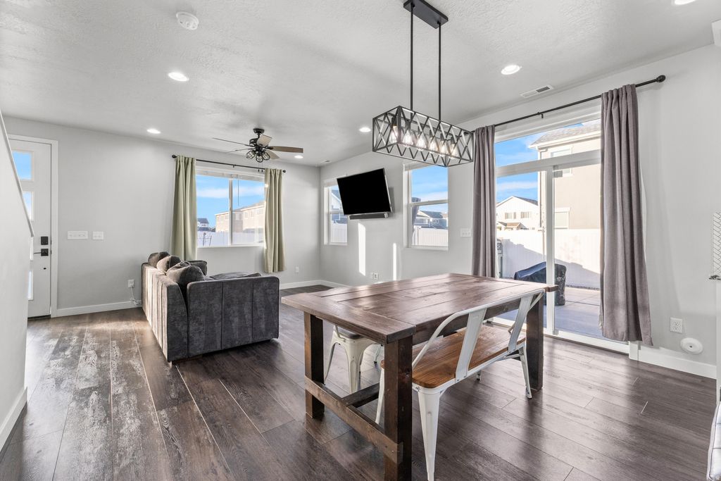 Don't miss this exceptional opportunity! This home is anything but ordinary, featuring one of the few floor plans with a main-level bedroom and full bathroom. Every detail has been upgraded, showcasing an abundance of natural light and spacious living areas. The kitchen boasts elegant white cabinets that reach the ceiling, stunning quartz countertops, and designer lighting. It's equipped with stainless steel appliances and a generous pantry. The primary suite is a true retreat, complete with a standalone tub, separate shower, quartz countertops and a spacious walk-in closet. The main-level bedroom and bathroom are ideal for guests or adult children. Step outside to an oversized concrete patio, perfect for entertaining. Located just minutes from Jensen Nature Park, the new Syracuse Sports Complex, shopping, dining, and a new elementary school, this home is perfectly positioned for an active lifestyle. Enjoy quick access to various walking trails and the new Davis Corridor freeway, making trips to Salt Lake effortless. Additionally, the neighborhood amenities include a pool, clubhouse, and gym-all for a low monthly HOA fee that even covers front yard maintenance! Book your appointment today for a private showing before it's gone!