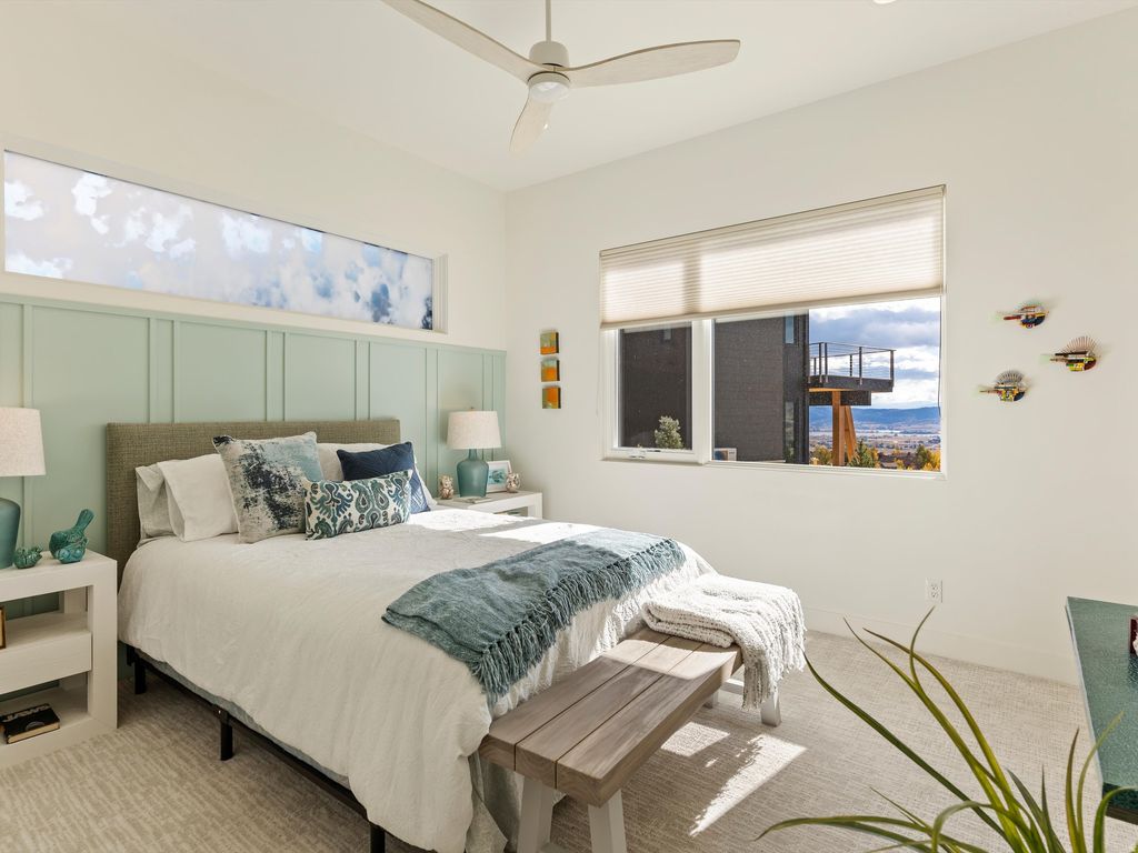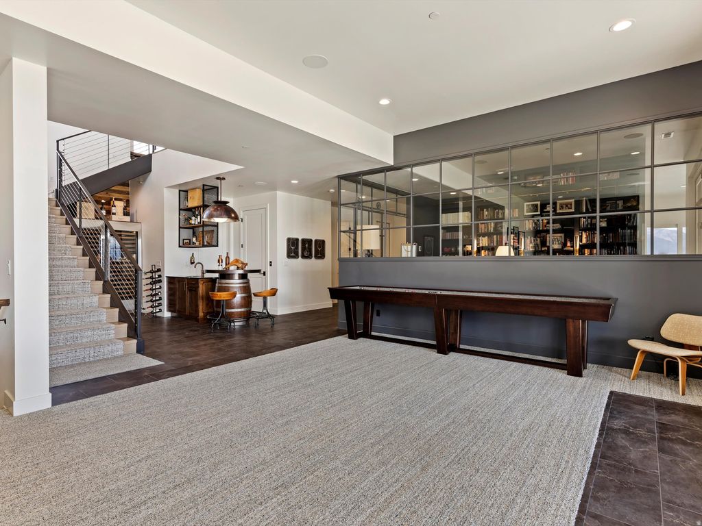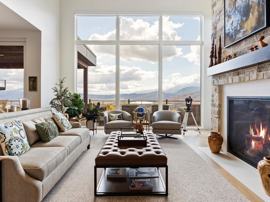 Experience luxury living in the Highlands at Wolf Creek with this stunning Mountain Modern estate, designed by Bertoldi Architects and built by Big Canyon Homes. The home is furnished with an exquisite collection of high-end furnishings, including several custom-designed and handcrafted pieces created specifically for the residence, thoughtfully selected to enhance the architecture and refined aesthetic of the home. Enjoy unobstructed views of Ben Lomond, Snowbasin, and Pineview Reservoir through expansive windows and seamless indoor/outdoor living spaces. The open-concept main level features a chef's kitchen with double ovens and sinks, a Wolf range, a walk-in pantry, and a spacious laundry room with built-in lockers. The Great Room showcases a dramatic floor-to-ceiling stone fireplace and trifold doors that open to a wraparound deck with high-end decking and an outdoor firepit. The elevated primary suite offers a modern fireplace, flexible bonus space, private deck access, a spa-like ensuite, and a generous dressing room. All bedrooms are ensuite, complemented by two additional powder rooms with distinctive finishes. The lower level features tall ceilings, a covered patio with a Bullfrog spa, a glass-enclosed office/library, a wine area and wet bar, and a dedicated fitness room. Additional highlights include Sonos throughout, automated shades, a Murano chandelier, low-maintenance landscaping, gas hookups for grill and fire pit, and a heated oversized driveway with a three-car garage and upgraded storage. Ideally located minutes from Powder Mountain, Nordic Valley, Pineview Reservoir, Wolf Creek Golf Course, and Ogden Valley's extensive trail network. Buyer to verify all information.