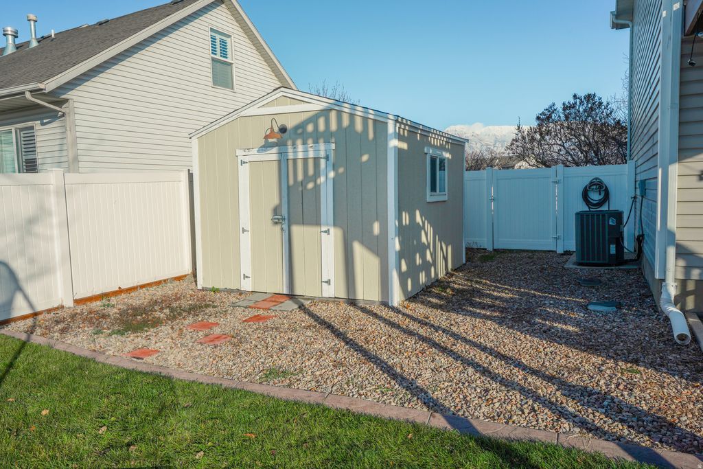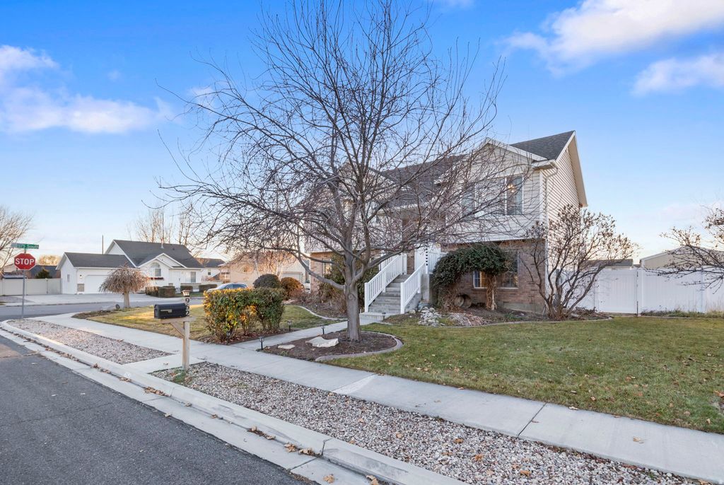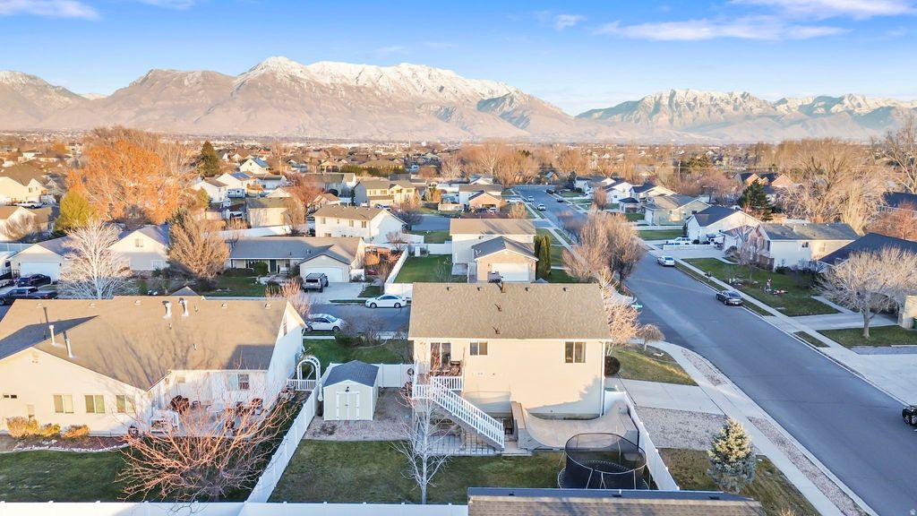 Beautifully updated home on a premium corner lot with stunning mountain views from both the front and back. The main living area upstairs features vaulted ceilings and expansive windows that capture incredible views and natural light. Enjoy sunsets from the tall, newly repainted back deck overlooking a fully fenced yard with a perfect mix of grass, pavers, and a shed with power-ideal for storage or hobbies. This home has been thoughtfully updated throughout, including a brand-new roof and gutters (2025), thick new carpet (2024), updated appliances, modern light fixtures, porch light timers, and dimmers in main living areas. Has an oversized, extra-wide two-car garage plus RV parking which adds rare functionality. The lower level is not a basement-it offers full windows, excellent natural light, and a newly finished, stylish bathroom and laundry room. Upstairs there is a spacious primary suite including a large bathroom with an oversized soaking tub, uncommon for this floor plan. Additional highlights include mature trees, fully fenced in backyard, south-facing driveway for easier winters. Conveniently located for shopping and amenities in Lehi.