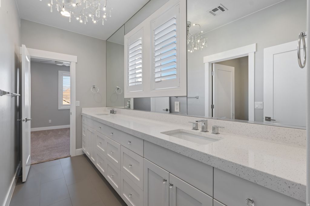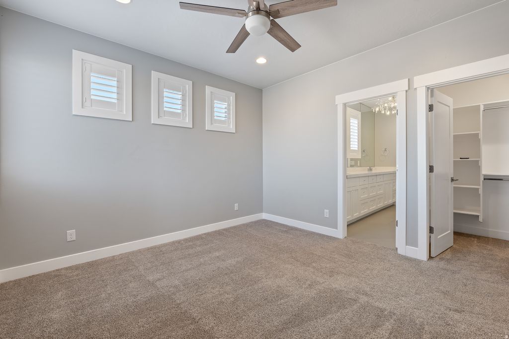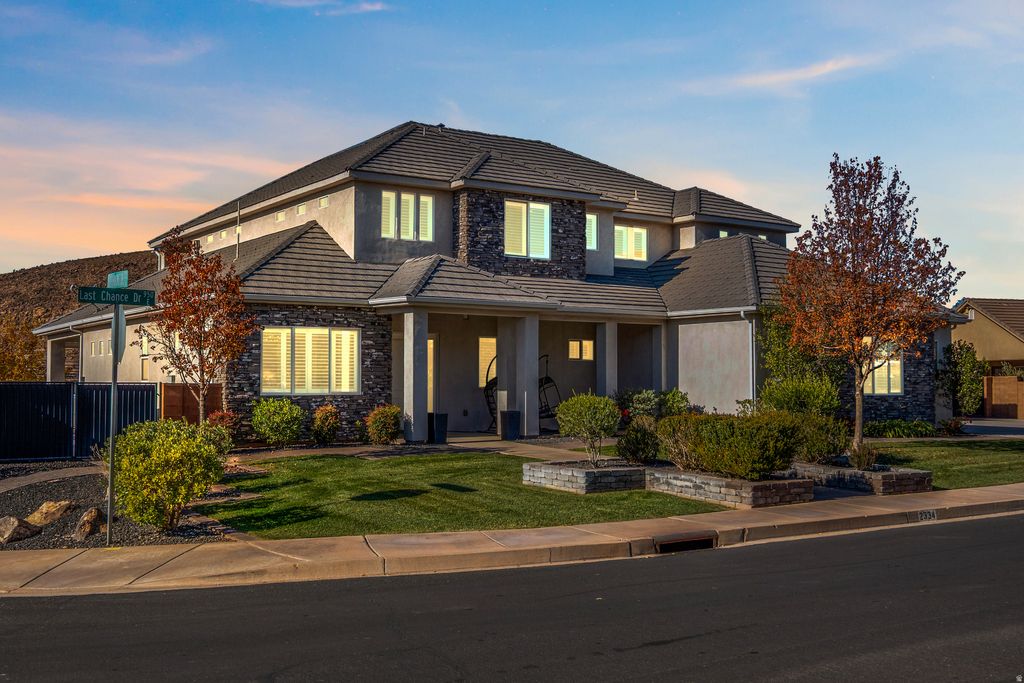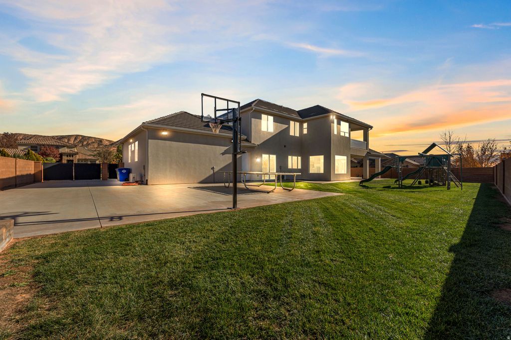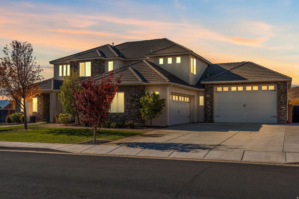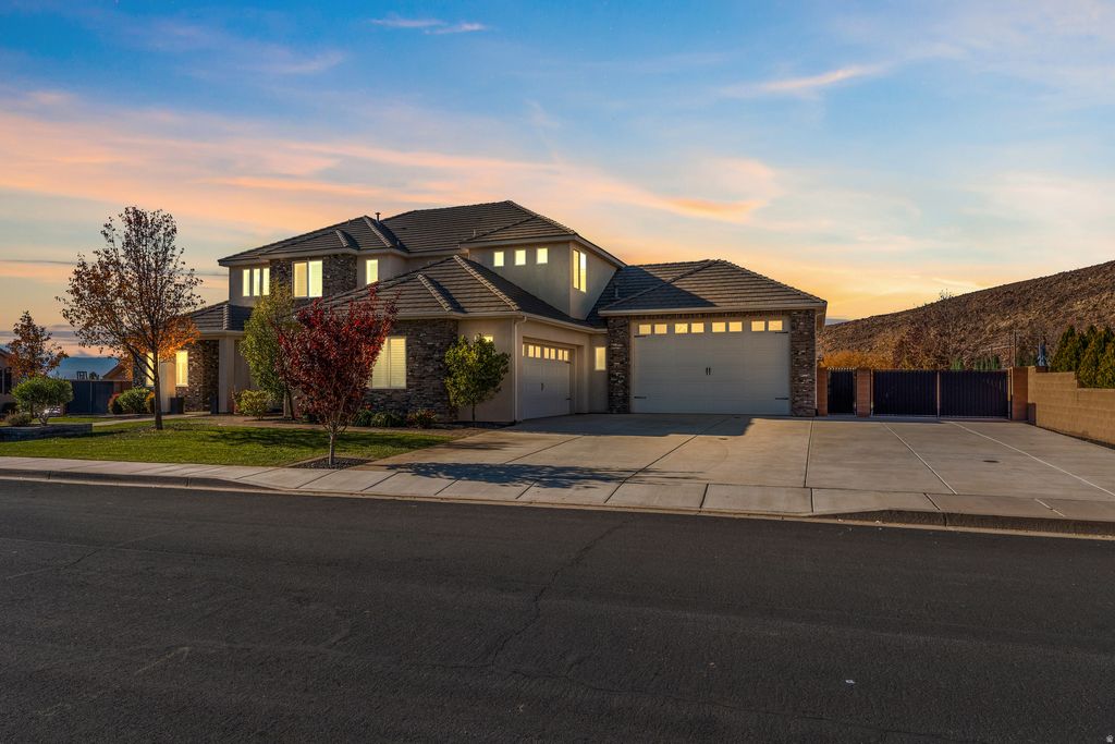 Discover this exceptional Washington Fields home set on a generous .38-acre corner lot, offering privacy, beautiful views, and ample space for a future pool. The stunning kitchen offers double ovens, a drop-in cooktop, Scotsman pebble ice maker, reverse osmosis, oversized fridge/freezer, a large hidden butler's pantry, decorative hood, huge island, and a window overlooking the backyard. The great room includes a gas fireplace, floating shelves, custom built-ins, and abundant natural light. Enjoy a spacious main-level laundry room with a sink plus secondary hookups upstairs, a stylish mud bench, and generous storage throughout. The thoughtful layout includes a Jack-and-Jill bathroom with quartz counters and double vanities, tiled shower surrounds, and a luxurious primary suite with a coffered ceiling, private patio, and views of the mountains and Red Cliffs Temple. The primary bath features a soaker tub, steam shower with rain head, and a walk-in closet with built-in drawers. Automated blinds enhance comfort and convenience. The oversized 4-car garage includes a mini-split HVAC system, and the home provides an unfinished basement with 10 ft. ceilings, separate garage entrance, and excellent potential to finish for added living space or rental income.
