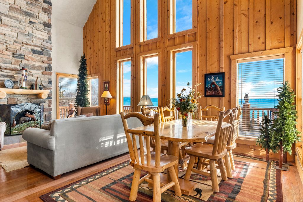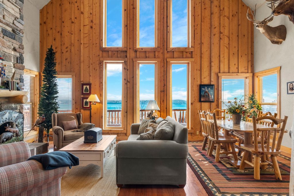 This beautifully designed three-level home offers 3 bedrooms and 3 bathrooms, with a private bedroom and bath on each floor-perfect for hosting. The layout includes a basement, main level, and upstairs, providing both comfort and flexibility. Upstairs, is a loft area that creates a cozy playroom or hangout space for kids. The large kitchen features stunning custom cabinetry with ample storage and workspace, ideal for gatherings and everyday living. The great room is filled with natural light from expansive picture windows that frame breathtaking views of Bear Lake. A sunroom with windows all the way around offers the perfect spot to relax and take in the scenery year-round. Most of the furniture is included, making this home truly move-in ready and an excellent option for a vacation getaway or full-time living. The 2 car detached garage has an almost finished room above it that could be used as a game room and sleeping area.