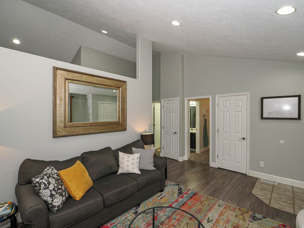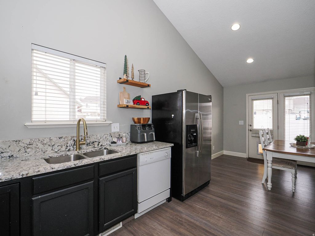 Rambler-style end-unit townhome with recent updates including laminate flooring, tile, carpet, baseboards, and a new furnace. Bright, open living room with vaulted ceilings and large windows. Kitchen features vaulted ceilings, recessed lighting, and dining area with access to a fully fenced backyard. Enjoy a full concrete patio with included fire pit-ideal for entertaining. Spacious primary bedroom with en-suite bath, plus a second main-level bedroom with its own bathroom. Partially finished basement offers room to customize. Convenient location near Thanksgiving Pointe in Lehi, shopping, dining, entertainment, and freeway access.