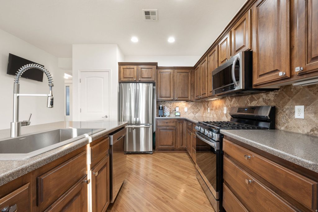 Located in the highly desirable Coral Canyon community with low HOA fees and fantastic amenities, this beautifully maintained home sits on an oversized .24-acre lot that extends 15 feet beyond the back fence and backs to open space - giving you extra privacy and room to breathe. Enjoy true outdoor living under the 750 sq ft covered patio with mountain views and immaculate landscaping - your own private retreat. Inside, the open-concept layout shines with natural Knotty Alder cabinetry, Corian countertops, and a cozy family room featuring a gas fireplace, new wood mantel, and custom built-in bookcases. A formal living room adds flexible entertaining space. Smart split floor plan with 4 spacious bedrooms + den/office with French doors. The 2.5-car garage includes custom cabinets, overhead storage, and an epoxy floor. Major bonuses: whole-home water filtration, recirculating hot water system, plus updated lighting and fans throughout. Space, upgrades, privacy, and views - all in one of the area's most sought-after neighborhoods.