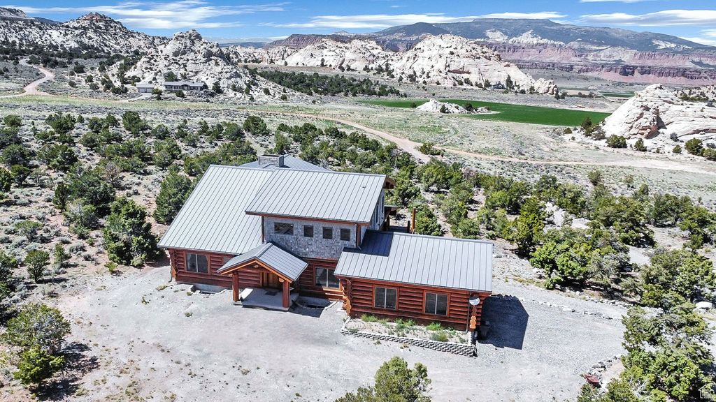Nestled on 12.34 acres of natural landscape in the serene and picturesque Teasdale, Utah, this stunning log home offers the perfect blend of rustic charm and modern comfort. With three spacious bedrooms and three well-appointed bathrooms, this residence is ideal for those seeking a tranquil retreat or a luxurious primary residence. The home boasts huge vaulted ceilings that create an open, airy ambiance throughout the living areas. The large windows let in abundant natural light and offer breathtaking views of the surrounding landscape. A huge deck spans the back of the home, providing ample space for outdoor entertaining, relaxing, and soaking in the stunning views. Additionally, a private hot tub offers the perfect spot to unwind after a long day. The oversized kitchen is a chef's dream, featuring modern appliances, ample counter space, and custom cabinetry. It's designed to accommodate both everyday meals and large gatherings. The master bedroom is a true retreat with its own private balcony offering privacy and comfort. The basement has a double glass garage door to store all your toys. This remarkable log home combines the best of rustic and contemporary living, making it a unique find in Teasdale. Whether you're enjoying a quiet evening on the deck, entertaining friends in the spacious kitchen, or exploring the vast acreage, this property promises an unparalleled lifestyle. The property is surrounded by a pristine natural landscape, offering peace, privacy, and the opportunity to enjoy the great outdoors right at your doorstep. Close to great fishing, hunting, ATV trails, and hiking. Don't miss the chance to own this exquisite piece of paradise. Schedule a viewing today and experience the magic of this log home for yourself!