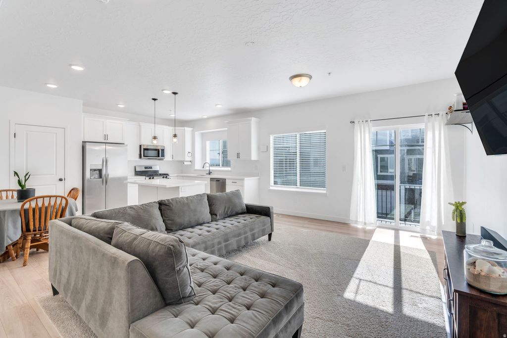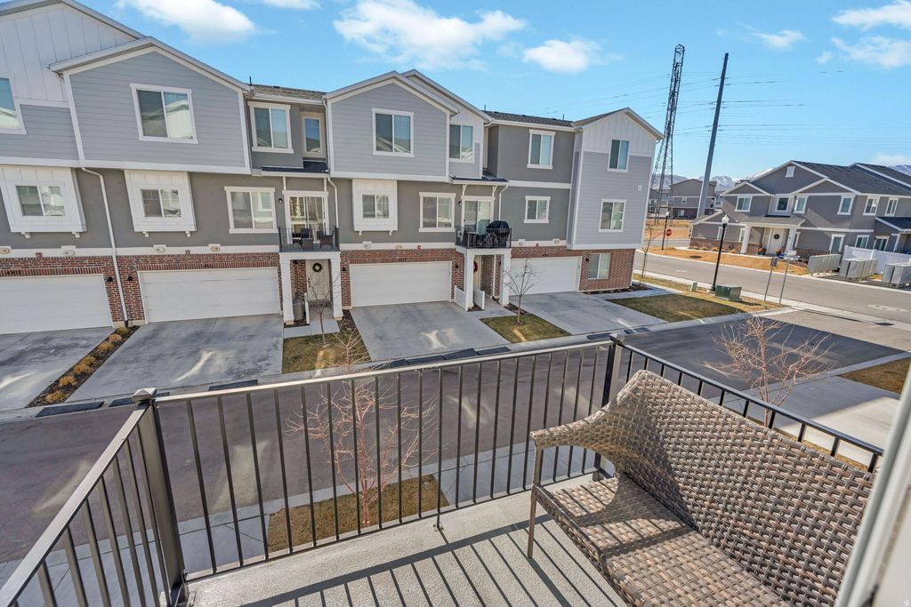 Modern and well-maintained townhome in Riverton's desirable Parkside community. The main level features a bright kitchen with sleek white cabinetry, quartz countertops, and a breakfast bar for additional seating, flowing seamlessly into the open-concept living area with direct access to a private balcony. Just off the two-car garage, a functional mud area includes built-in bench seating and coat hooks for everyday convenience. Upstairs, the spacious primary bedroom offers an ensuite bathroom with generous counter space. Enjoy low-maintenance living with HOA amenities that include landscaping care, a set monthly water bill, and coverage for trash and recycling. Ideally located in the heart of Riverton, Utah, with easy access to Mountain View Shopping Village, Bangerter Highway, and nearby dining, shopping, and commuter routes. Measurements provided as a courtesy only, buyer to verify all info.