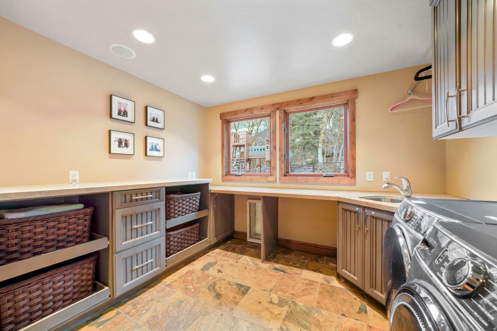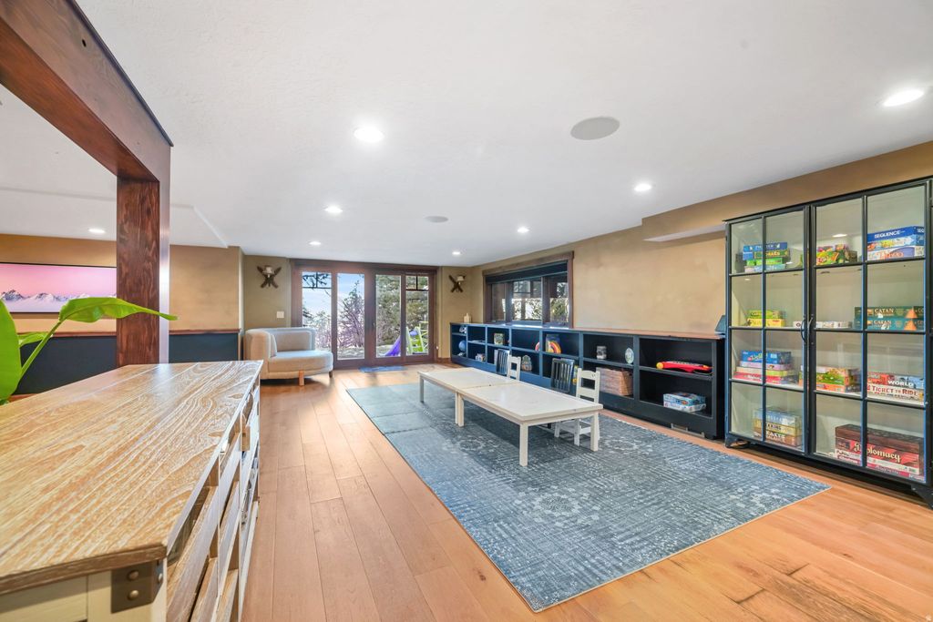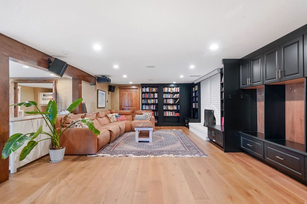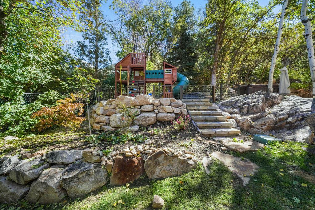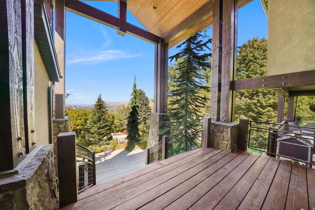 Custom luxury home located in Salt Lake City's highly sought-after Olympus Cove at the base of Mount Olympus, offering sweeping valley, city and mountain views and the end of the cul da sac. The main level is designed to maximize views and livability, featuring an open entry anchored by a floor-to-ceiling stone fireplace and expansive windows that frame the surrounding landscape. The kitchen includes a generous island, a full suite of high-end appliances, custom cabinetry, a large walk-in pantry, and adjacent main-floor laundry. A waterfall feature integrated into the exterior connects the home naturally to the mountainside and serves as a distinctive architectural element. A designated home gym overlooks the valley. The home offers 7 bedrooms and 6 bathrooms, including a spacious primary suite on the main level with deck access and an en-suite bath featuring dual vanities and a steam shower, as well as double walk in closets. The upper level includes two bonus spaces, one currently used as an office with incredible views overlooking Neffs Canyon.The fully finished walkout lower level provides additional living space, including a dedicated theater room, custom bunkroom, additional guest bedroom, and a versatile bonus room suitable for recreation or entertaining. Ample custom built-ins are found throughout, along with a concealed wine room integrated into the cabinetry. Additional upgrades include radiant in-floor heating throughout the main living areas, primary suite, driveway, and walkways, a home sound system, backup generator, play set, and hot tub. The elevated setting provides privacy while remaining conveniently close to freeway access, downtown Salt Lake City, Salt Lake International Airport, and year-round outdoor recreation.