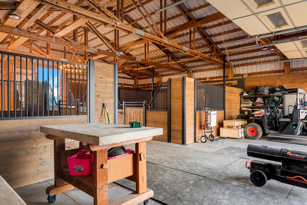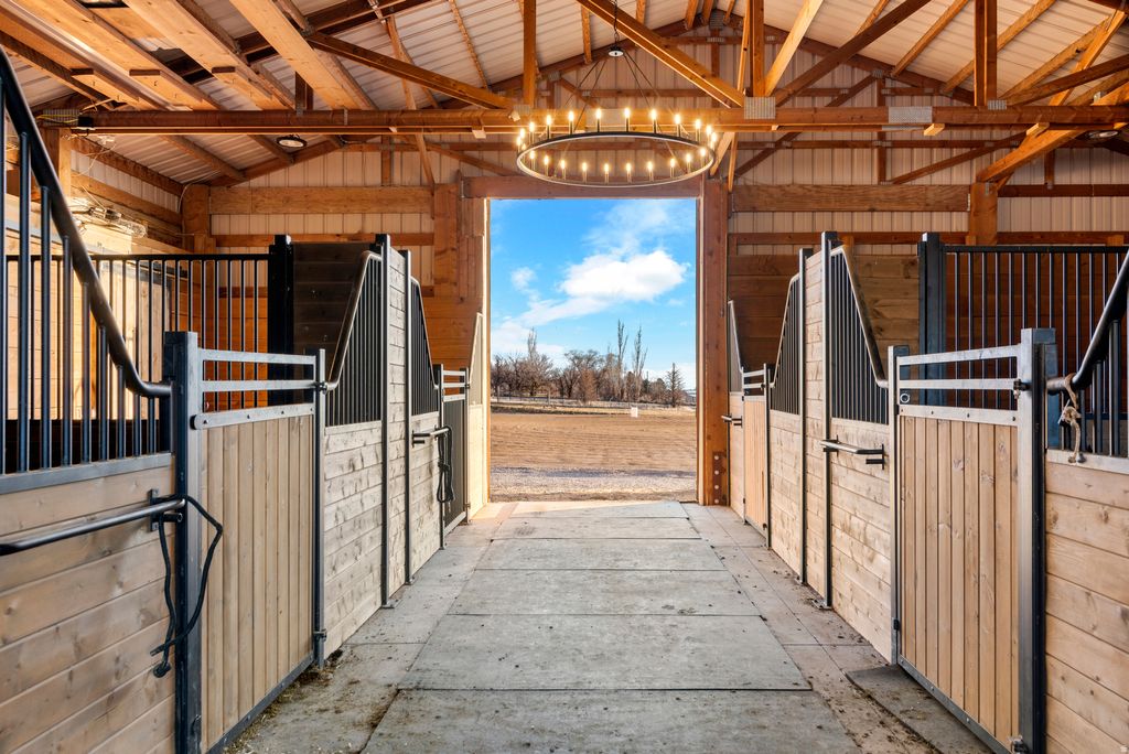 Stunning 6-bed home with 6,000+ sq ft on 5 acres. Features LVP floors, upgraded kitchen, radiant heat, luxe primary w/ porch & views. Finished walkout basement w/ fireplace, theater wiring & patio. Heated garages, sprinklers, equestrian setup w/ barn, arena & pastures. Inside, you'll find waterproof LVP flooring throughout, an upgraded kitchen featuring stainless steel appliances, granite countertops, and radiant heat with three zones. Just off the kitchen is a versatile space ideal for a butler's pantry or craft room. The spacious primary suite includes access to a charming covered porch with breathtaking mountain views, while the primary bath boasts an impressive custom walk-in closet. The fully finished walkout basement offers 9-foot ceilings, a large family room with a cozy gas fireplace that is prewired for speakers and a projector, making it ideal for a home theater setup. This level also includes a music-themed room, a dedicated space perfect for a home gym, and a large full bathroom. The basement opens to a covered patio, perfect for outdoor enjoyment. The attached 2-car garage is gas-heated with its own thermostat, with an additional rear garage providing extra storage. Recent upgrades include a newer water softener, instantaneous hot water, and a sump system. A smaller garage with 220V power is ideal for lawn equipment or recreational toys. The landscaped yard features a 22-zone sprinkler system. The home's acre is on culinary water, with the remaining 4 acres on irrigation water. Enjoy mature fruit trees, including peach, plum, apricot, and almond. Equestrian amenities include an over 1,800 sq ft detached barn with four stalls and outdoor runs, a 60' round pen, a 200' x 160' arena, three pipe-fenced pastures with shelter, and another larger pipe-fenced pasture offering room for future development.