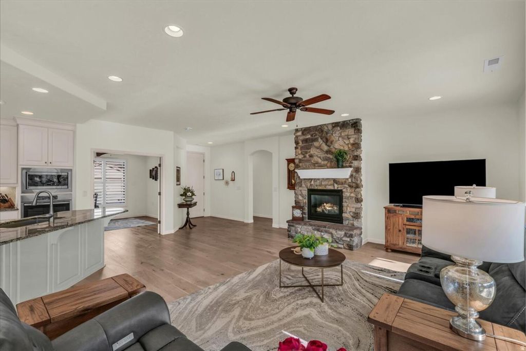 Come see why this is the most popular floor plan in SunRiver! This home offers a bright and open layout that feels welcoming the moment you walk in. Solar tubes bring natural light into the living spaces, highlighting the cozy fireplace and the seamless flow between the living room, dining area, and kitchen. The large center island is perfect for casual entertaining and is complemented by stainless steel appliances. Just outside, you can relax on the shaded patio overlooking a low-maintenance southern backyard with artificial turf. The living quarters are designed for flexibility and comfort. The primary suite features upgraded shutters and walk-in closet organizers, with direct access to the covered patio. There is a second bedroom and full bath, plus a versatile den with beautiful stained glass and a Murphy wall bed and desk, so it can easily serve as a home office or a third bedroom. You will have plenty of room for vehicles and toys in the 4-car garage, which is finished with epoxy floors, upgraded lighting, and a lift for storage. The home also features EverLights permanent exterior lighting, storm doors, upgraded fans, and added attic insulation. Life at SunRiver puts resort-style amenities at your doorstep, including a 35,000 square foot community center, golf, a restaurant, pools, pickleball, tennis, a fitness center, and miles of scenic trails. With breathtaking state and national parks just minutes away, this home is not just a place to live but a gateway to your next adventure.