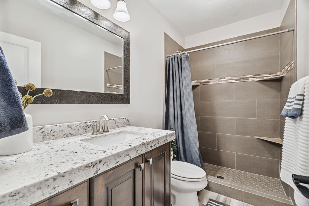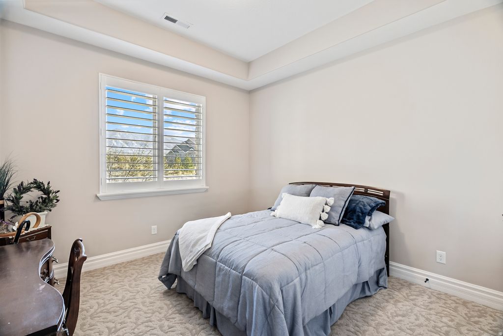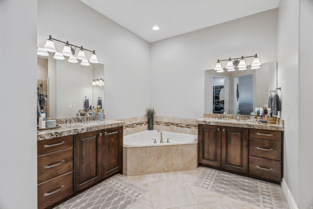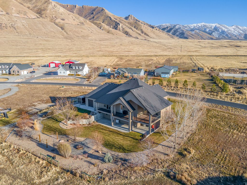 Stunning custom home tucked away on a quiet cul-de-sac in East Erda, set on over 2.5 acres with breathtaking views. This property offers a thoughtfully designed custom floor plan filled with high-end finishes, including plantation shutters, 10-foot ceilings, tray and coffered ceilings upstairs, and a striking iron front door that makes a grand first impression. The primary suite is designed for comfort and convenience, featuring a private entrance into the laundry area with washer and gas dryer right off the walk-in closet. T The spacious walk-out basement boasts 9-foot ceilings and incredible flexibility for entertaining, relaxing, or multi-generational living. Complete with a kitchenette, separate laundry (washer and electric dryer), and an outlet ready for a future hot tub on the patio. A private entrance through the garage adds even more versatility. Step outside from the main level onto the covered patio - perfect for year-round entertaining while taking in the sweeping scenery. A gas line is already plumbed for outdoor cooking or fire features. The beautifully landscaped yard includes a cozy fire pit area and plenty of room to bring your animals and toys. Equestrian-ready amenities include a horse shed, covered hay storage, and a frost-free water spigot in the pasture. Car enthusiasts and adventurers will love the impressive garage with abundant space for vehicles, toys, and storage, plus a separate 220-amp RV hookup on the side of the garage. Additional highlights include two furnaces for efficient climate control (upstairs and downstairs). Water right 15-5437 with 1.59 acre feet of water included. Square footage figures are provided as a courtesy estimate only and were obtained from county records. Buyer is advised to obtain an independent measurement.
