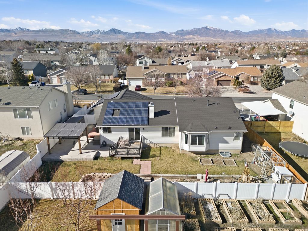 The home has a high-end dual-fuel heat pump and gas furnace system-an $18,000+ upgrade. When temperatures are above about 35 degrees, the heat pump runs because it's extremely energy-efficient and keeps heating costs low. When temperatures drop below freezing, the system automatically switches to the gas furnace for powerful, reliable heat. It also circulates and filters fresh outside air, improving indoor air quality. It's designed for comfort, efficiency, and long-term savings. Exceptional six-bedroom, three-bath home in a prestigious and quiet area of West Jordan. West-facing for cool evenings and sunset views. Features a three-car garage, extensive RV parking, and a fully fenced yard. The primary suite is conveniently located on the main level with no stairs. Two fully remodeled kitchens with quartz countertops, a stunning double-sided fireplace, and a dedicated theater room make this home ideal for luxury and multi-generational living. Major updates include a dual HVAC system (3 years old), brand-new roof, newer water heater and AC, and fully paid-off solar panels. Enjoy outdoor living with low-maintenance Trex decking and a beautiful pergola. Solar panels paid for So home is completely energy efficient. Also that the home has peach and pear trees.