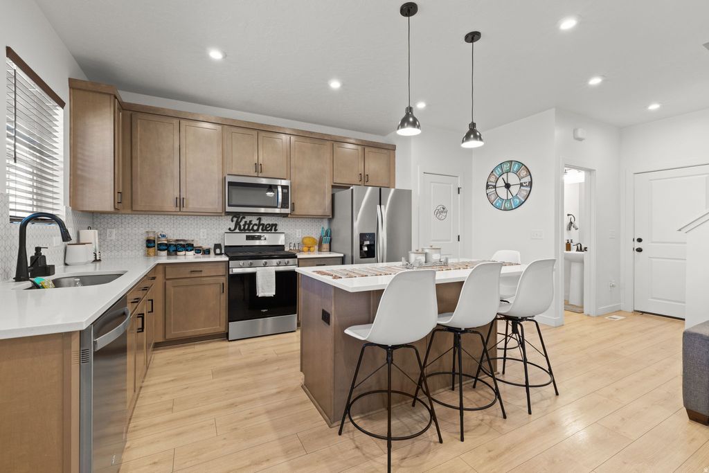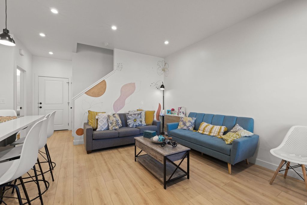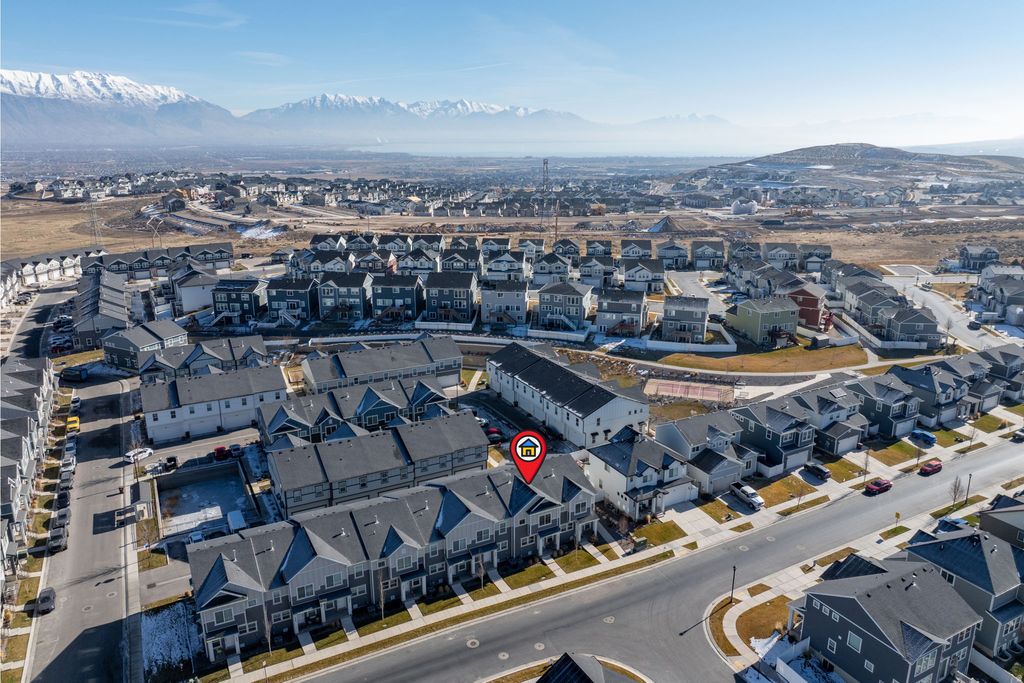 Welcome to this beautifully maintained, nearly new townhome in the heart of Eagle Mountain. Built in 2022, this spacious residence offers just under 2,000 square feet of thoughtfully designed living space with 4 bedrooms, 3.5 bathrooms, and a rare 2-car garage. The main level features an open-concept layout filled with natural light, showcasing durable wood-style flooring, recessed lighting and a modern kitchen designed for everyday living and entertaining. The kitchen includes quartz countertops, stainless steel appliances, ample cabinetry, and a generous island with bar seating that flows seamlessly into the dining and living areas. Upstairs, you'll find a spacious primary suite with a private bathroom and walk-in closet, along with additional bedrooms that offer flexibility for guests, a home office, or growing households. The finished basement provides the fourth bedroom and an additional bathroom, offering excellent separation of space that is ideal for guests, a home office, or multi-generational living. Enjoy low-maintenance living in a growing community close to parks, trails, schools, and everyday conveniences. Property is pending third-party approval and is priced aggressively to reflect current market conditions, presenting a strong opportunity for buyers seeking space, comfort, and value in Eagle Mountain.