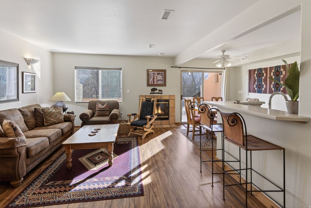 AMAZING SETTING - Next to Moab's Golf Club, this delightfully maintained Castillo de las Rocas unit is completely turn-key ready for you! The main level has beautiful Saltillo tile throughout the entry and kitchen alongside the cozy living room with gas fireplace. Exceptional outdoor space off the dining room adjacent to hole 13 for you to soak in the phenomenal Moab Rim views. This level also has a one car garage and full bathroom. The upper level offers 2 bedrooms, bonus flex-room, a full bathroom, and gracious closets. Enjoy living next to the sunny community pool within walking distance to upper Mill Creek hiking trails and world class 4x4 trailhead access. Located in the Overnight Lodging Overlay, this bright home has established rental history and is ready to be your vacation rental, second home, or your primary residence!