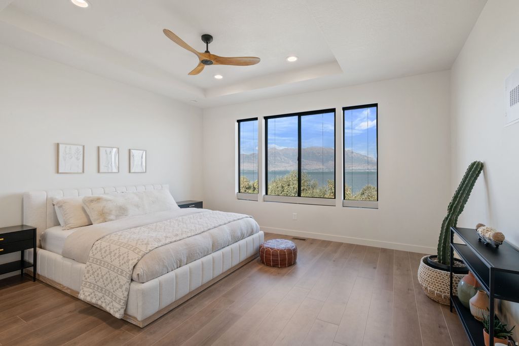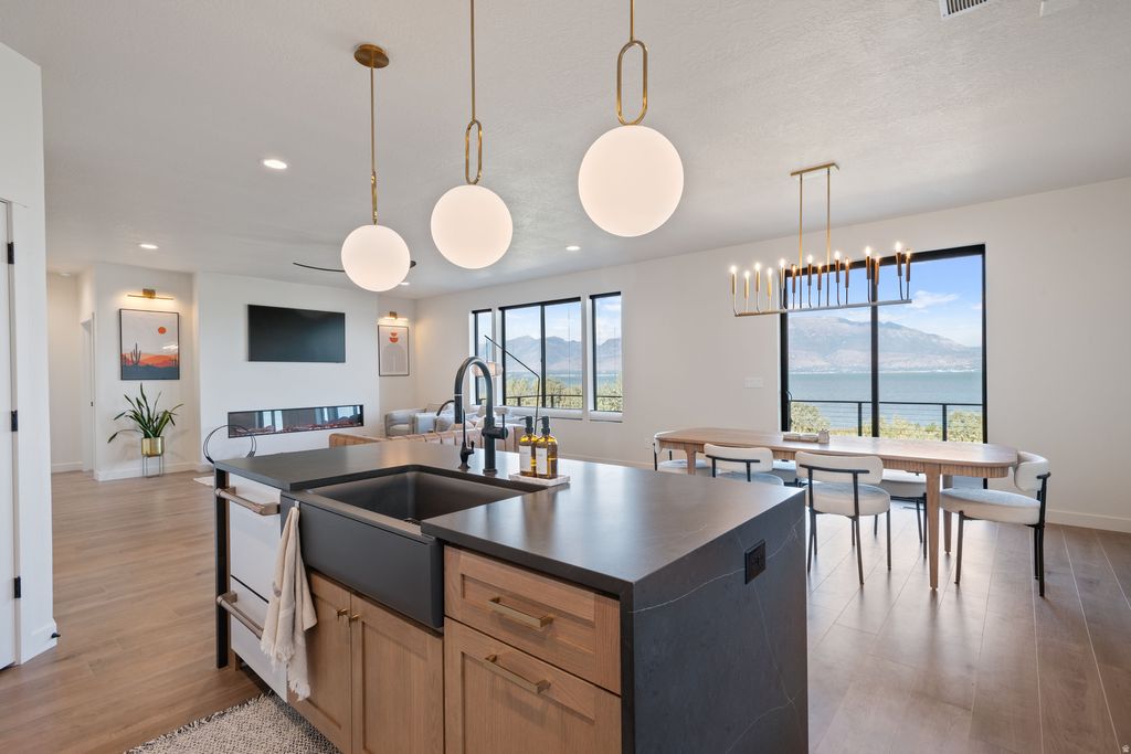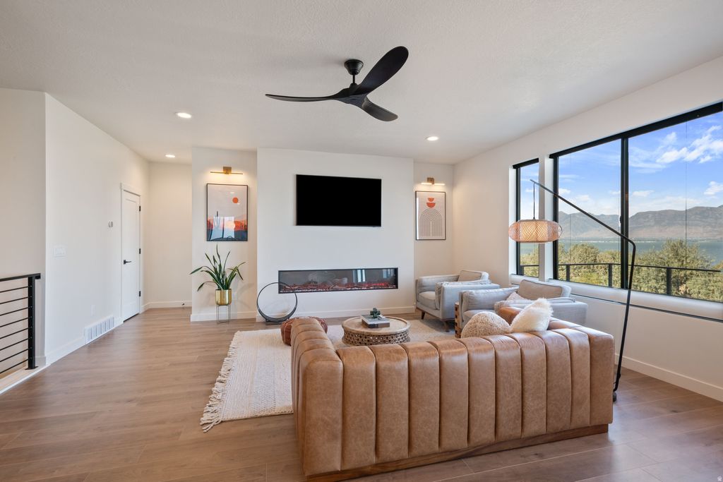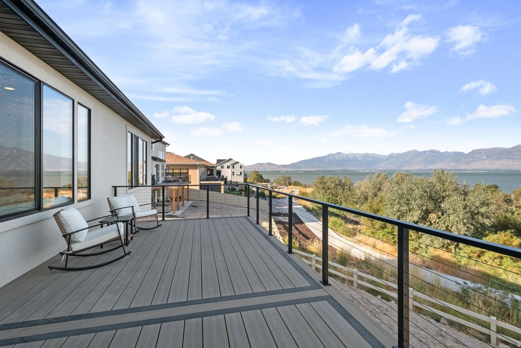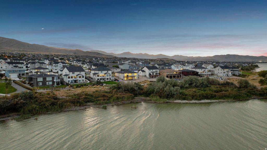 RARE UTAH LAKEFRONT LUXURY. Thoughtfully designed as a high-end rambler, this home delivers elegant main-level living with comfort, accessibility, and timeless style. Extensive custom upgrades throughout reflect a no-expense-spared approach to quality. Outdoor living is extraordinary. Expansive, professionally designed decks frame unobstructed lake and mountain views with no backyard neighbors. A modern spiral staircase connects multiple spaces for entertaining or relaxing, while the backyard offers a rare blank canvas for a custom outdoor sanctuary-ideal for refined landscaping or outdoor entertaining. Interior highlights include Cafe white appliances, custom office cabinetry, a basement kitchenette, two fireplaces, and custom built-ins, and striking inside-out black windows that create a clean, modern aesthetic. The primary suite showcases stunning lake and mountain views, a spa-inspired bath with a separate tub and shower, and a fully customized walk-in closet. Additional features include modern top-down, bottom-up window coverings, premium water softening and filtered drinking water systems on both floors, a finished garage with epoxy flooring and EV-charging, and exterior conveniences such as an outdoor BBQ gas line and hot tub outlet. Move in now and enjoy lakefront living from day one. Opportunities like this are limited, making it an exceptional option for buyers seeking a true waterfront lifestyle. A fully furnished option is available at the right price, and special mortgage savings may be offered to qualified buyers.