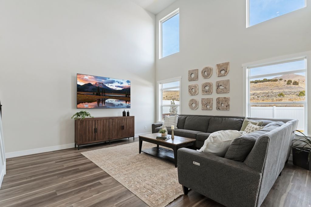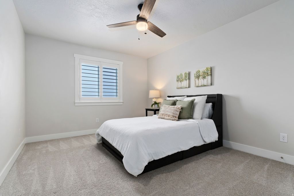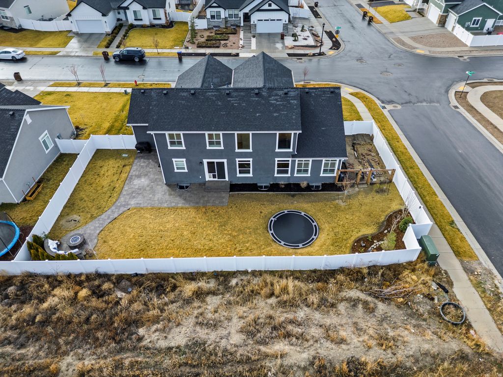 Positioned on a corner lot near the Saratoga Springs border, this 2022-built Eagle Mountain home offers over 4,500 square feet, dramatic two-story ceilings, and move-in ready space without the wait of new construction. Just off the entry, a dedicated main-level office or den offers flexible space for remote work, a sitting room, or formal dining. Expansive windows fill the great room with natural light, highlighting the soaring ceilings and open floor plan. The kitchen features white cabinetry, granite countertops, stainless steel appliances, and generous island seating, seamlessly connected to the main living space for everyday function and gathering. The main-level primary suite provides privacy and convenience, complete with a soaking tub, separate glass shower, dual vanities, and an oversized walk-in closet. Window coverings throughout include plantation shutters and custom roller shades. Upstairs offers four additional bedrooms plus a versatile bonus room ideal for a loft, playroom, office, or media space. The unfinished basement provides room to expand and future flexibility. Outside, the fully fenced flat backyard includes an extended paver patio, built-in gas fire pit with seating, and gas hookup for grilling - offering functional outdoor living and usable space that can be hard to find in the area. The three-car garage and extended driveway provide ample parking and storage. Located just minutes from The Ranches Golf Course, neighborhood parks, trails, and improved highway access toward Silicon Slopes. No HOA.