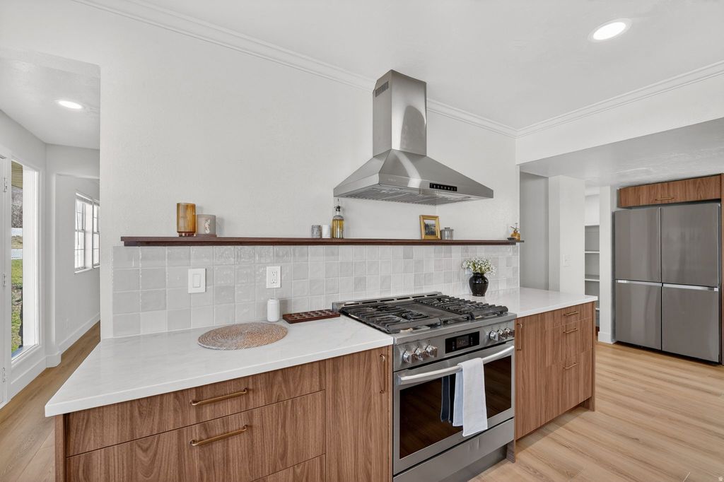 Explore this Updated Kaysville property perfectly situated on a spacious lot with stunning mountain views! This fully updated home with a New Kitchen w/ Quartz Counter tops, New cabinets, Appliances, offers a comfortable and functional layout including 2 main gathering areas on the Main floor, a generously sized primary suite with a private on-suite bath and walk-in closet and Private Balcony to enjoy the evening sunsets over the great Salt Lake and Antelope Island. One of the standout features of this property is the three garages/shops, providing incredible space for storage, hobbies, or agricultural use. You'll also find ample storage throughout the home, from the basement to the outbuildings. The yard offers a rare combination of space and versatility, mature trees, open areas, and room to expand, garden, or simply enjoy the outdoors. Whether you're looking for extra workspace, privacy, or a property with character, this one truly stands out.