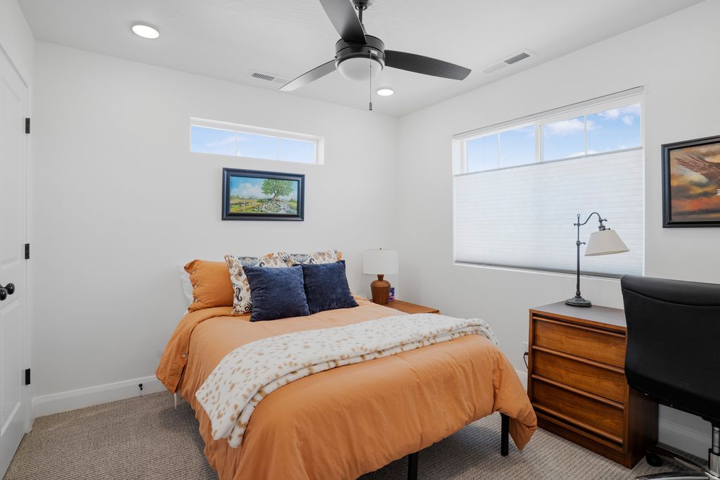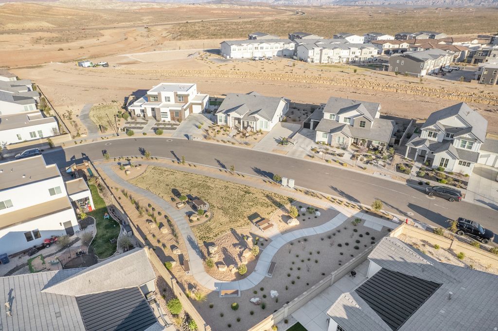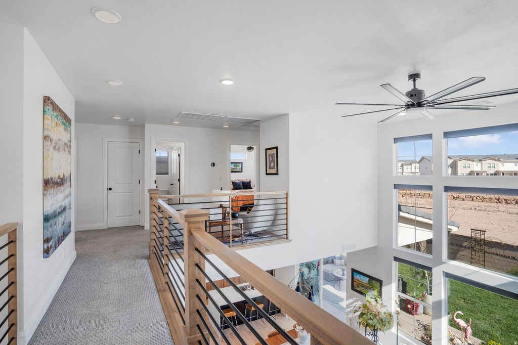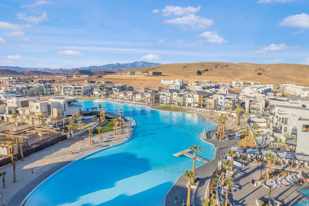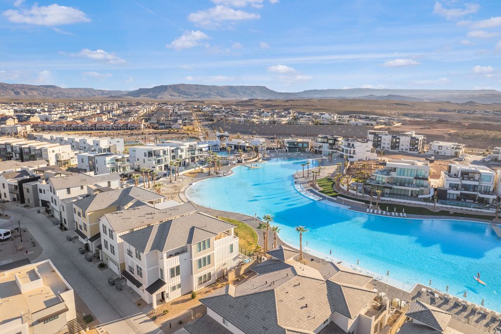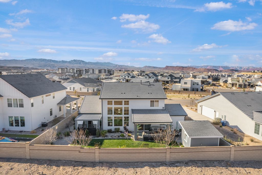Welcome to this beautifully upgraded home in the sought-after Desert Color resort community in St. George, Utah--known for its stunning lagoon, resort-style amenities, and vibrant lifestyle. This thoughtfully designed home blends modern finishes, functional spaces, and seamless indoor-outdoor living. The main level features engineered European White Oak hardwood floors and an electric fireplace with designer tile surround that anchors the open-concept great room. Large windows bring in abundant natural light and include Lutron-controlled custom blinds, while top-down/bottom-up cellular shades provide privacy and flexibility. Stained wood and metal stair railings add warmth and character, while floating vanities and Moen chrome fixtures elevate the bathrooms. The kitchen features floor-to-ceiling cabinetry, quartz countertops with a waterfall island, GE appliances, soft-close drawers, pull-out shelving, under-cabinet lighting, a double sink, and a spacious pantry with outlets. An 8-foot sliding glass door opens to the covered patio, creating the perfect space for entertaining and outdoor dining. The primary suite offers a peaceful retreat with a sliding glass door leading to a pergola-covered patio with privacy screens. The spa-style bathroom includes an 8-foot tiled shower with rain shower head, floating double vanity, custom closet system, and stackable washer/dryer hookup. Upstairs features 3 bedrooms with mountain views, a full bathroom with updated tile and cast iron tub, an upgraded laundry room with cabinetry, and a cozy loft space. Additional highlights include an epoxy garage floor, hanging storage racks, water softener, and a climate-controlled studio shed with mini split, LVP flooring, ceiling fan, and custom blinds Residents enjoy the iconic 2.5-acre lagoon, white sand beaches, pools, pickleball courts, parks, trails, and year-round community events--just minutes from Snow Canyon and Zion National Park.