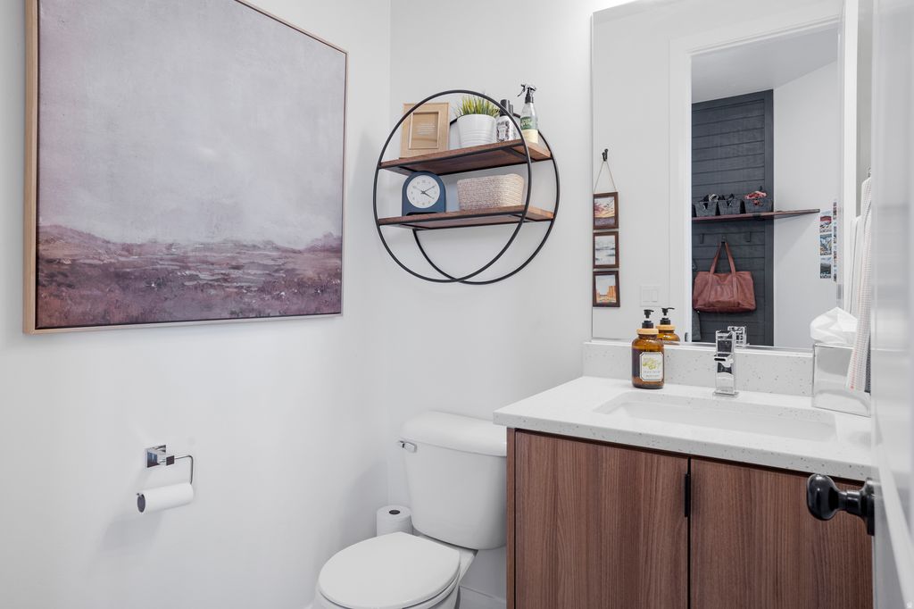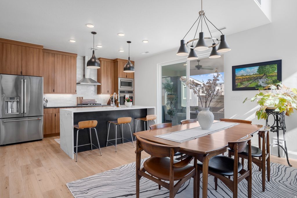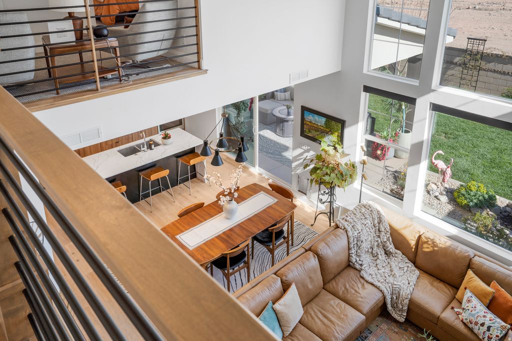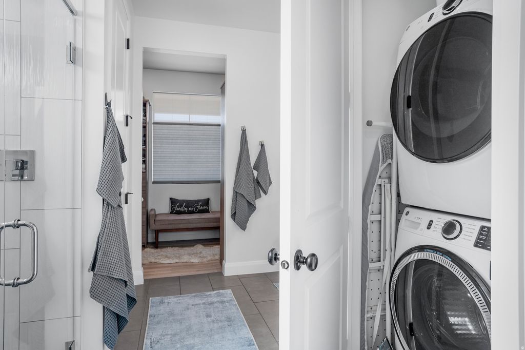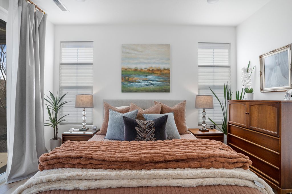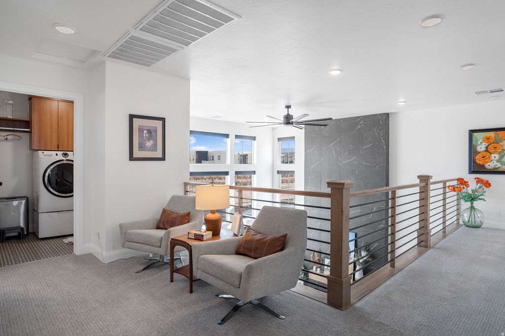 Welcome to this beautifully upgraded home in the sought-after Desert Color resort community in St. George, Utah--known for its stunning lagoon, resort-style amenities, and vibrant lifestyle. This thoughtfully designed home blends modern finishes, functional spaces, and seamless indoor-outdoor living. The main level features engineered European White Oak hardwood floors and an electric fireplace with designer tile surround that anchors the open-concept great room. Large windows bring in abundant natural light and include Lutron-controlled custom blinds, while top-down/bottom-up cellular shades provide privacy and flexibility. Stained wood and metal stair railings add warmth and character, while floating vanities and Moen chrome fixtures elevate the bathrooms. The kitchen features floor-to-ceiling cabinetry, quartz countertops with a waterfall island, GE appliances, soft-close drawers, pull-out shelving, under-cabinet lighting, a double sink, and a spacious pantry with outlets. An 8-foot sliding glass door opens to the covered patio, creating the perfect space for entertaining and outdoor dining. The primary suite offers a peaceful retreat with a sliding glass door leading to a pergola-covered patio with privacy screens. The spa-style bathroom includes an 8-foot tiled shower with rain shower head, floating double vanity, custom closet system, and stackable washer/dryer hookup. Upstairs features 3 bedrooms with mountain views, a full bathroom with updated tile and cast iron tub, an upgraded laundry room with cabinetry, and a cozy loft space. Additional highlights include an epoxy garage floor, hanging storage racks, water softener, and a climate-controlled studio shed with mini split, LVP flooring, ceiling fan, and custom blinds Residents enjoy the iconic 2.5-acre lagoon, white sand beaches, pools, pickleball courts, parks, trails, and year-round community events--just minutes from Snow Canyon and Zion National Park.