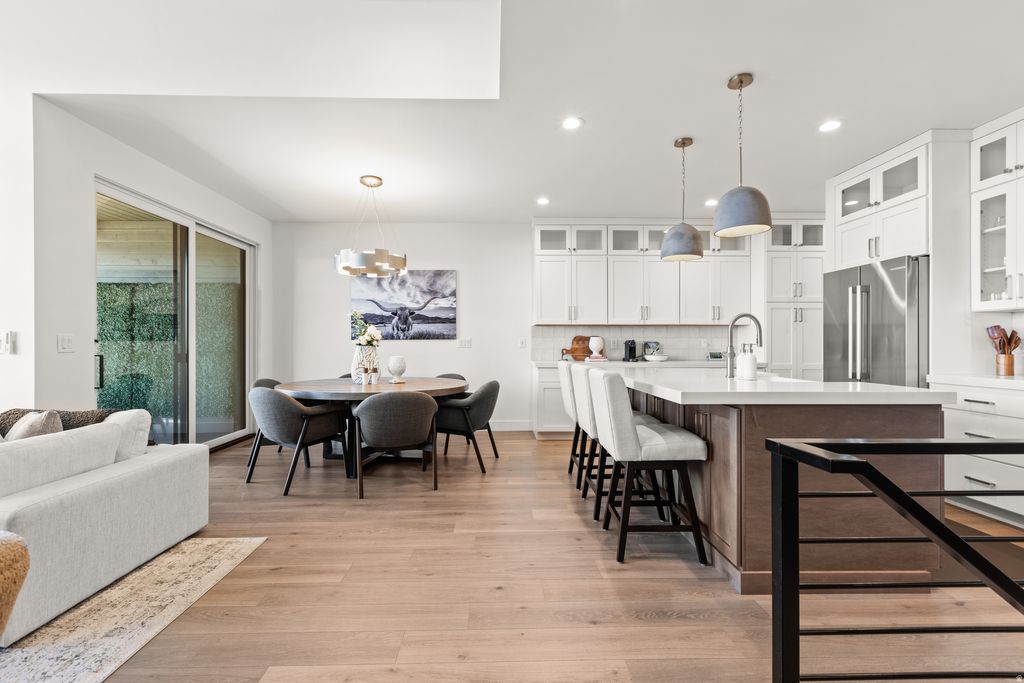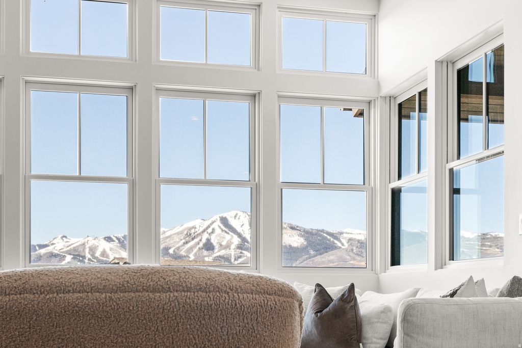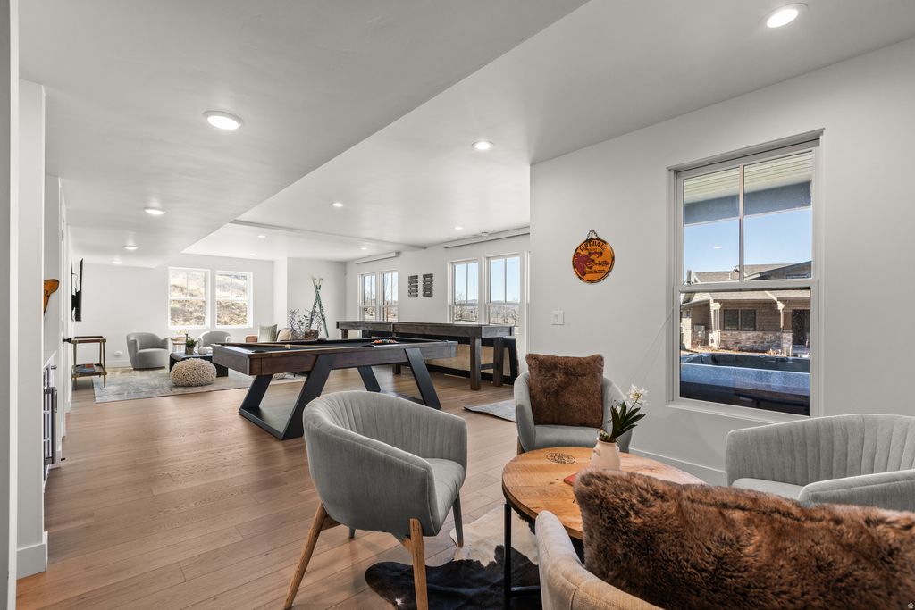Discover the Park City lifestyle from this mountain modern retreat with ski-run, mountain and water views. A thoughtful and meticulous attention to design & function went into the selection of numerous additional high-end upgrades for this main-level living townhome. Upgrades include extra-large primary bath with dual-vanities, striking floor to ceiling, sintered stone-slab fireplace face in the great room, kitchen/dining area lighting, fixtures, and Bosch stainless-steel appliances, built-ins on both levels, automatic blinds, and garage finished with epoxy floors and EV charger. Enjoy walk-out lower level with hot tub, large family/game room with dry bar and beverage fridge, 2 spacious bedrooms and 2 full baths. Recessed lighting throughout, high ceilings throughout and lots of natural light. Central AC, heat tape, tankless water heater. Ample guest parking adjacent to this end unit. Enjoy the Jordanelle State Park directly adjacent with access to trails, beaches, cabanas, bathrooms, perfect for walking dogs, paddle boarding, swimming, and canoeing. Quick access to skiing, shopping, dining, Park City and the airport. And nearby Richardson Flat Park & Ride connects to 3 main Park City Transit express routes, giving riders direct service into town and to ski resorts.