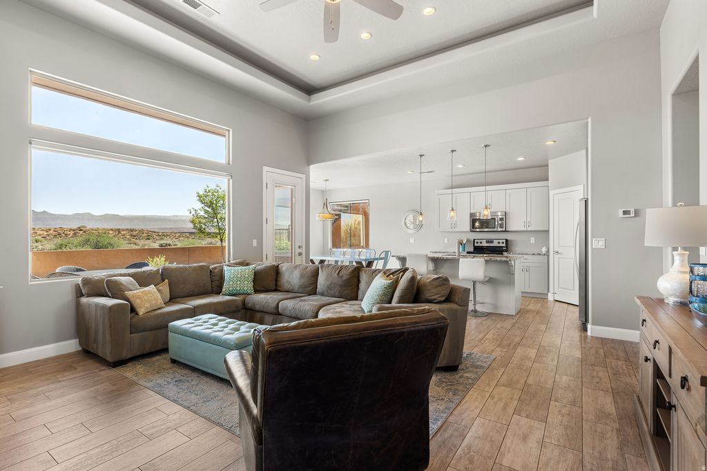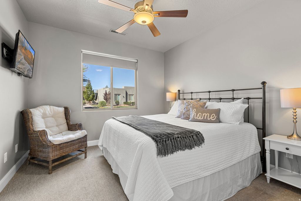 Stunning 4 bed, 4.5 bath home with every bedroom featuring its own ensuite bathroom, offering privacy and comfort for guests. Thoughtfully designed with the primary suite on its own side of the home, creating a true retreat separate from the additional bedrooms. The garage space is a standout, offering ample room for vehicles, toys, and storage, with wide streets throughout the community making access easy and comfortable. The home is also equipped with two water heaters, a water softener, and Dixie Power, which consistently ranks as one of the most affordable energy providers in the nation. This property captures incredible views and is located just minutes from Sand Hollow Reservoir, the dunes, Jellystone Water Park, and Pecan Valley Water Park, making it an ideal setup for anyone looking to fully enjoy Southern Utah living. The HOA fee covers full yard maintenance, making this a low-maintenance property, and gives you access to top-tier amenities including three pools, two hot tubs, a fitness center, and two pickleball courts. The community also hosts live music events and annual celebrations like the Car Show, Sky Fest Hot Air Balloon Festival, and Pioneer Day Celebration. Residents enjoy added perks with discounts and VIP access to golf, events, and UTV and watercraft rentals. Furniture and furnishings can be included, excluding beds and bed frames in the bedrooms. All information is deemed reliable but not guaranteed, buyer(s) to verify all.