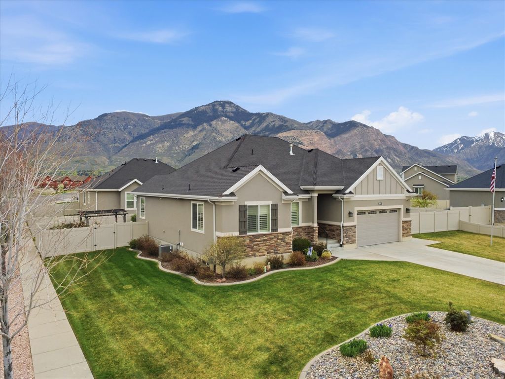 This well kept home offers 5 bedrooms and 2.5 baths with room to grow equity by finishing the basement. An inviting entry brings you into a comfortable great room with gas fireplace. The kitchen features granite counters, gas range, large pantry and dining area. You'll have everything you need including the laundry on the main level. The basement has two bedrooms finished and a bath with the toilet set and vanity ready to install. You can choose how to finish the bath, family room and if you want to keep a great shop space as it is with walkout basment. Outdoors you'll find a patio with structure to put a cover overhead for shade, a deck, and fenced yard with mow strip. Beautiful views of the mountains and attractive neighborhood, make this a must see on your home shopping list. You'll also love the convenient location to Highway 89, I-15 and Washington Blvd.