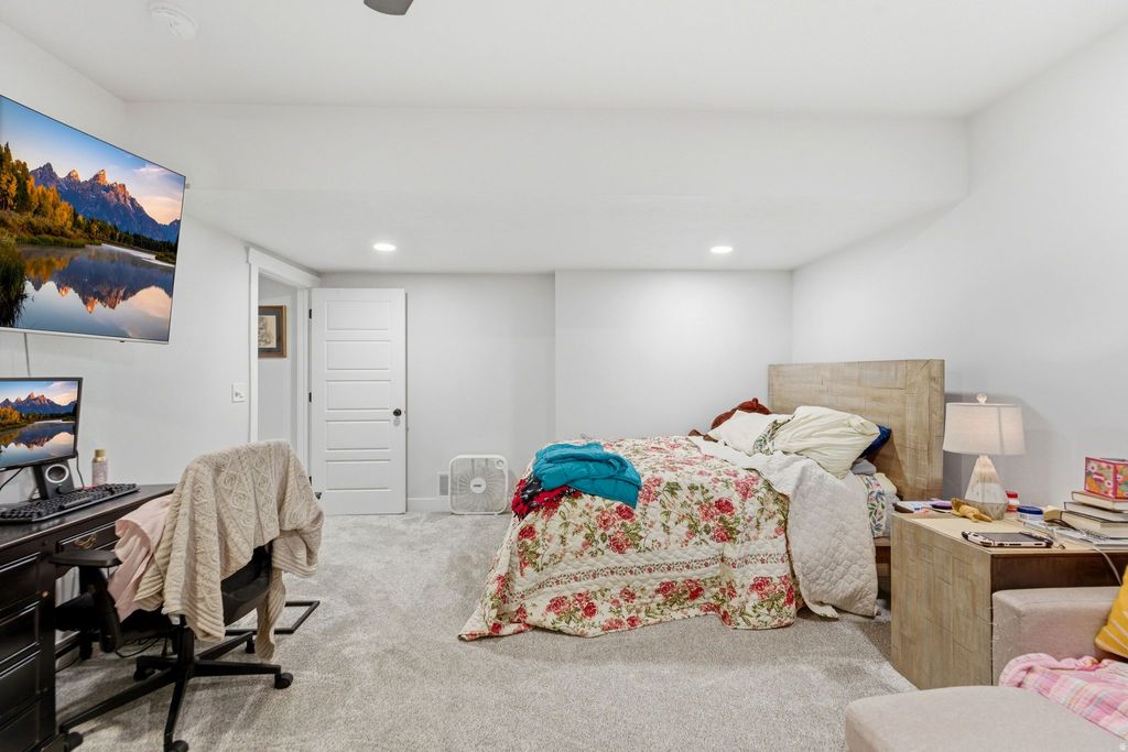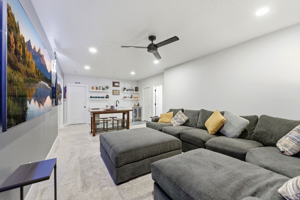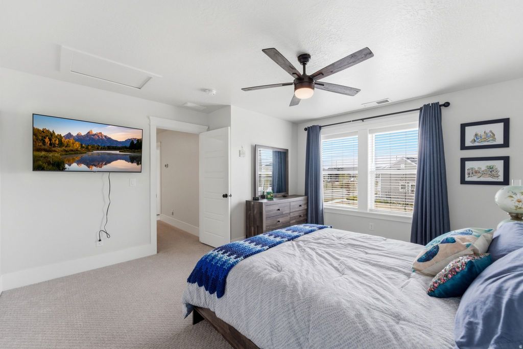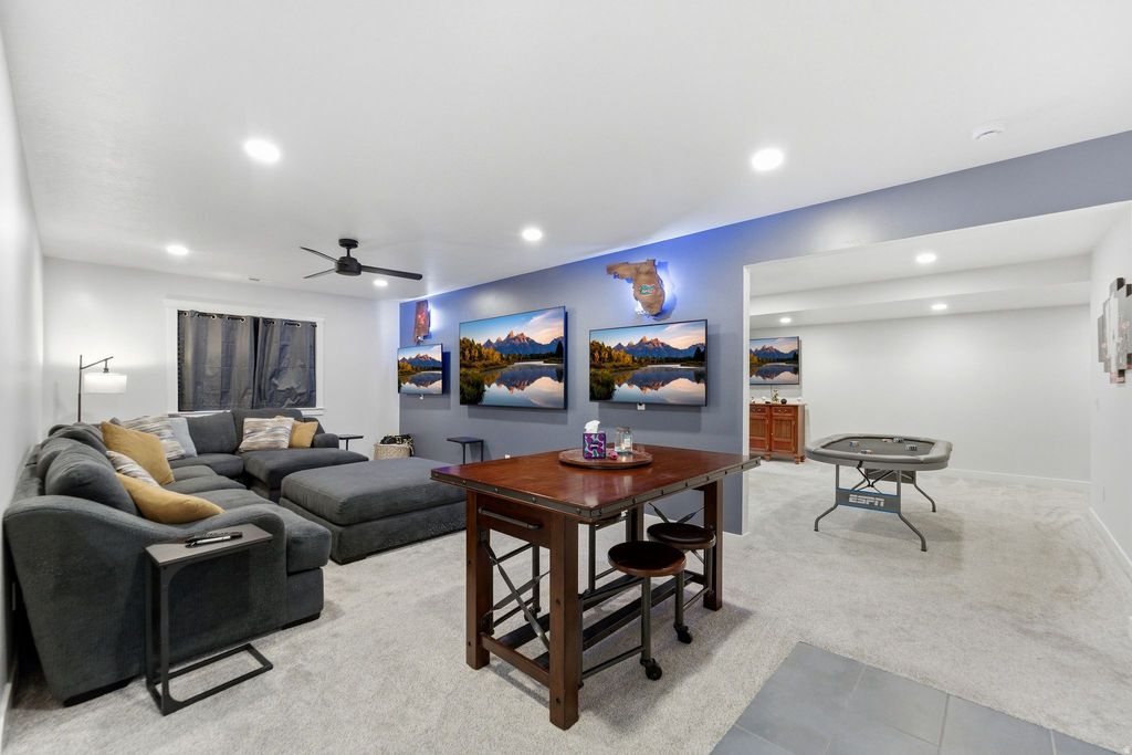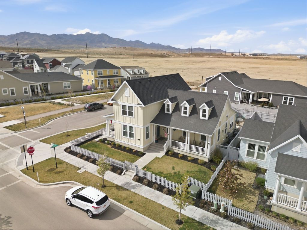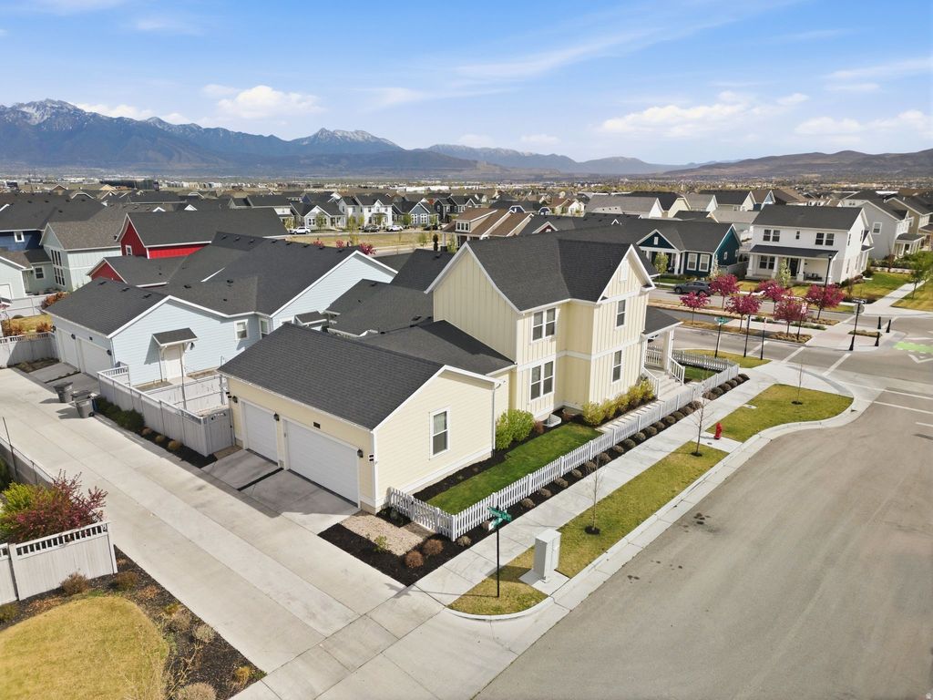 This stunning residence in the heart of Daybreak's Upper Villages offers the perfect blend of modern farmhouse design and functional luxury. Situated on a spacious corner lot, the Clearwater Farmhouse II floor plan by Destination Homes delivers an open, airy feel with soaring vaulted ceilings and designer beam accents. The gourmet kitchen serves as the centerpiece, featuring high-end cabinetry, sleek countertops, and a layout that flows effortlessly into the family room-ideal for hosting gatherings. For those who work from home, the dedicated main-floor office provides a quiet retreat with its own private exterior entrance, offering a professional touch for client meetings or a peaceful workspace. Main Level: Includes a sprawling primary suite with a spa-like bathroom and a walk-in closet, plus a spacious mudroom to keep the home organized. Upstairs: Three additional bedrooms provide plenty of room for family or guests. Basement: The massive basement offers over 2,000 sq. ft, one large bedroom, game room , theater space (TVs are included) large storage areas The oversized 3-car garage is a hobbyist's dream, featuring extended height, extra depth, and professional epoxy flooring. Located just blocks from the upcoming Watercourse, this home places you minutes from Aspen Elementary, neighborhood parks, pickleball courts, and local coffee shops. Enjoy the signature Daybreak lifestyle with miles of trails, community pools, and beautiful mountain views right from your front door.
