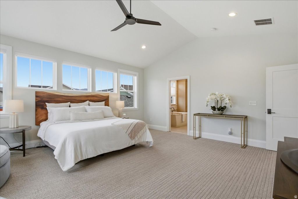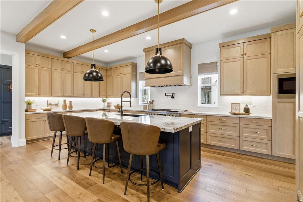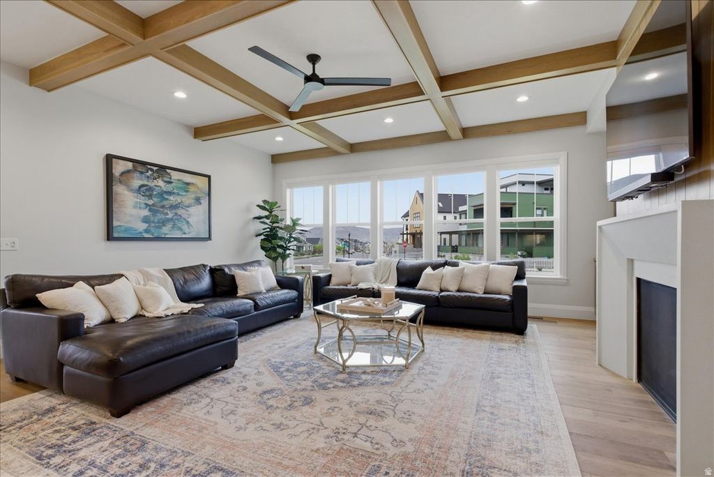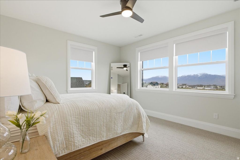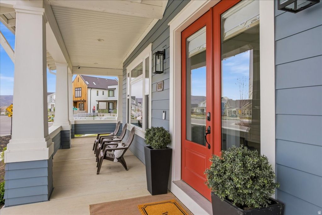 Used as a second residence and lived in for only a few months, this near-new home has been meticulously maintained and offers the benefit of completed construction without the timeline of building. Completed in 2024 and positioned on a premier corner lot-one of the largest along the watercourse-this home sits directly across from the waterways, in South Jordan's Daybreak community, with mountain views and a setting that feels open, quiet, and connected. Immediate access to walking paths and outdoor spaces enhances the lifestyle this location provides. Thoughtfully built by Rainey Homes, it stands apart through craftsmanship and intentional design. Wood-beamed and coffered ceilings, expansive windows, and custom built-ins create a sense of depth, warmth, and natural light throughout. Every space feels considered, elevated, and reflects a level of design rarely found in new construction. The main level is designed for both everyday living and entertaining, with a dedicated office, formal dining room, and a spacious family room anchored by a custom fireplace with a full wall of white oak built-ins. The layout flows seamlessly, defined by clean lines and layered textures. The kitchen is both refined and highly functional, featuring custom cabinetry, a statement hood with pot filler, paneled refrigerator and freezer, double dishwashers, pebble ice machine, oversized island, a generous walk-in pantry, and a dedicated coffee bar. Upstairs, the primary suite offers a true retreat with dual walk-in closets and a spacious, spa-inspired bath featuring extensive cabinetry and storage, a freestanding soaking tub, and an oversized walk-in shower. The fully finished basement expands the home's versatility with a large family room, dedicated gym, wet bar kitchenette, and additional living space well suited for guests or large families. Two laundry rooms-one on the upper level and one in the basement-add convenience and flexibility across the home. Additional features include a thoughtfully designed mudroom with built-in storage, custom window treatments throughout, a three-car garage with EV charging, and an expansive backyard with a large paver patio-set on one of the most usable lots along the watercourse. The home includes a dedicated gym, which is counted as a bedroom. A home defined by craftsmanship, thoughtful design, and a setting that is increasingly difficult to recreate.