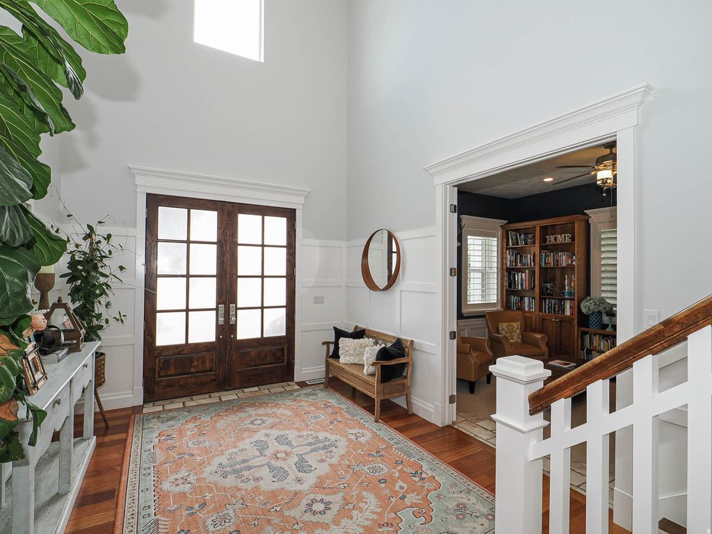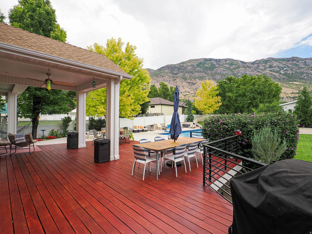 Welcome to one of Pleasant Grove's most exceptional properties, where luxury, privacy, and outdoor living come together on a beautifully landscaped half-acre lot with unobstructed mountain views. Designed for both everyday living and unforgettable entertaining, the backyard is a true retreat featuring a limestone pool surround, custom limestone retaining walls with built-in lighting, an in-ground pool and hot tub, and a fully equipped pool house complete with shower, storage, and washer and dryer. Enjoy evenings on the large covered deck with an indoor/outdoor fireplace while listening to Sonos speakers integrated throughout the home and backyard. Inside, the home features high-end finishes and timeless craftsmanship, including Brazilian cherry wood, hardwood floors, solid wood doors, 3/4" thick trim throughout, and transom windows across the upper level that fill the home with natural light. The gourmet kitchen is equipped with Wolf and Sub-Zero appliances and connects to a butler's pantry featuring a pebble ice maker and abundant storage. The oversized primary suite offers a private retreat with separate his and hers closets, a steam shower, oversized soaking tub, and extensive cabinetry, professionally re-stained in March 2026. Additional features include a whole-home water filtration system, built-in intercom and alarm system, and a basement with the potential to be converted into an ADU, easily. The property also offers exceptional parking and storage with a pull-through third-car garage, oversized two-car garage, and a large driveway with plenty of parking for guests, trailers, or recreational vehicles. Located in a highly desirable Pleasant Grove neighborhood near Manila Pond, with wide streets and quick access to the Murdock Canal Trail and Valley Vista mountain biking trails, this home offers the perfect balance of luxury living and outdoor lifestyle. This is a rare opportunity to own a meticulously built home on a premier lot in one of Pleasant Grove's most sought-after areas.