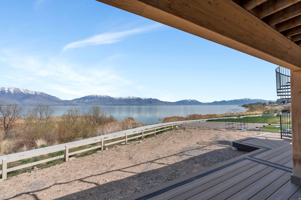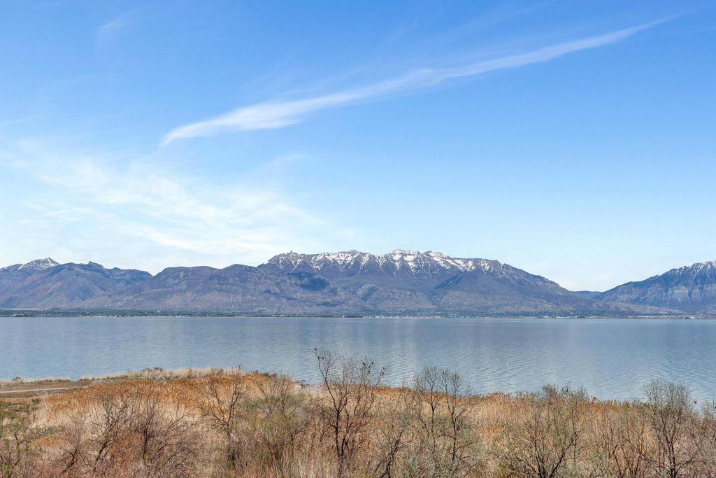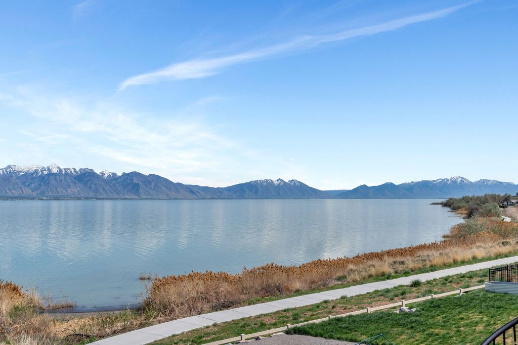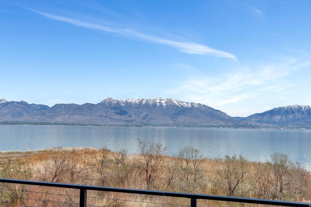 One of the rarest opportunities on Utah Lake - a true waterfront rambler in Saratoga Springs with unobstructed lake and mountain views, no backyard neighbors, and seamless main level living. Step inside and panoramic water views greet you through modern black framed windows that flood the space with natural light. The kitchen is anchored by Caf appliances including a double oven and gas range, complemented by sleek white cabinetry and an open layout that flows effortlessly into the living area. The primary suite captures lake and mountain views and features a spa inspired bath with dual sinks, separate tub and shower, and a custom walk in closet with built in storage. A dedicated home office with custom cabinetry and an additional main floor bedroom round out the main level. Downstairs, the fully finished walkout basement offers flexible space for guests, multi generational living, or elevated entertaining - complete with a second electric fireplace with built in shelving, a wet bar, basement kitchenette, and built in dining cabinetry with direct patio access. The outdoor living is exceptional. Expansive professionally designed decks give way to a striking modern spiral staircase leading to the covered lower patio, all oriented to capture sunrises over the water and golden hour sunsets in the evening. The backyard presents a rare canvas to create a fully customized waterfront retreat on Utah Lake. Additional features include a finished garage with epoxy flooring and EV charging, premium water filtration systems on both levels, BBQ gas line, and hot tub outlet. Measurements provided as a courtesy only, Buyer to verify all information.