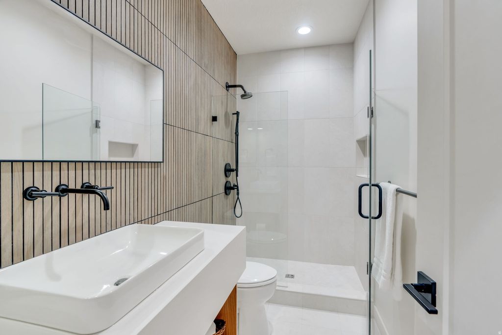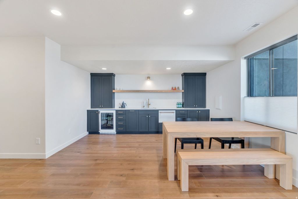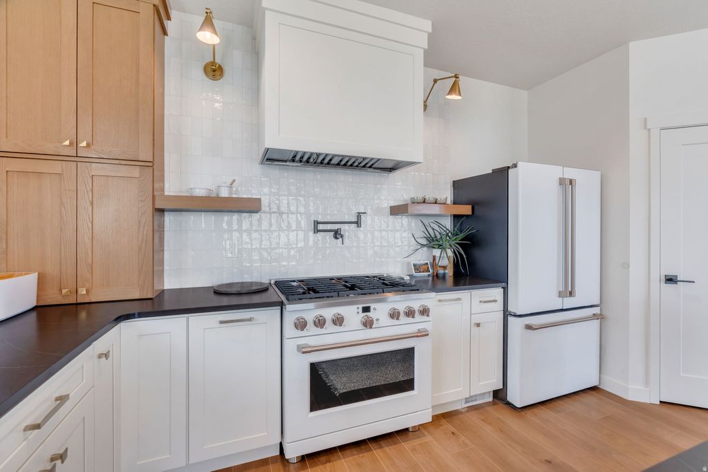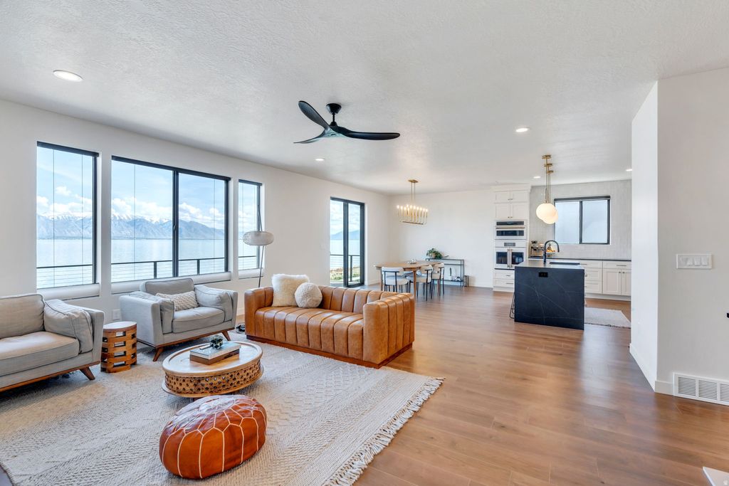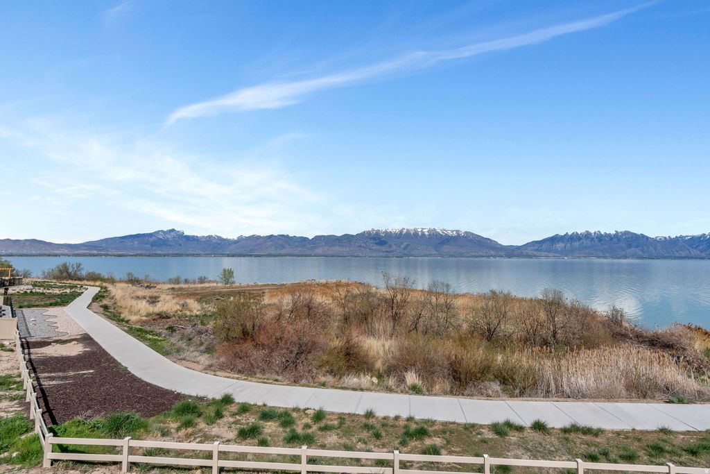 One of the rarest opportunities on Utah Lake - a true waterfront rambler in Saratoga Springs with unobstructed lake and mountain views, no backyard neighbors, and seamless main level living. Step inside and panoramic water views greet you through modern black framed windows that flood the space with natural light. The kitchen is anchored by Caf appliances including a double oven and gas range, complemented by sleek white cabinetry and an open layout that flows effortlessly into the living area. The primary suite captures lake and mountain views and features a spa inspired bath with dual sinks, separate tub and shower, and a custom walk in closet with built in storage. A dedicated home office with custom cabinetry and an additional main floor bedroom round out the main level. Downstairs, the fully finished walkout basement offers flexible space for guests, multi generational living, or elevated entertaining - complete with a second electric fireplace with built in shelving, a wet bar, basement kitchenette, and built in dining cabinetry with direct patio access. The outdoor living is exceptional. Expansive professionally designed decks give way to a striking modern spiral staircase leading to the covered lower patio, all oriented to capture sunrises over the water and golden hour sunsets in the evening. The backyard presents a rare canvas to create a fully customized waterfront retreat on Utah Lake. Additional features include a finished garage with epoxy flooring and EV charging, premium water filtration systems on both levels, BBQ gas line, and hot tub outlet. Measurements provided as a courtesy only, Buyer to verify all information.